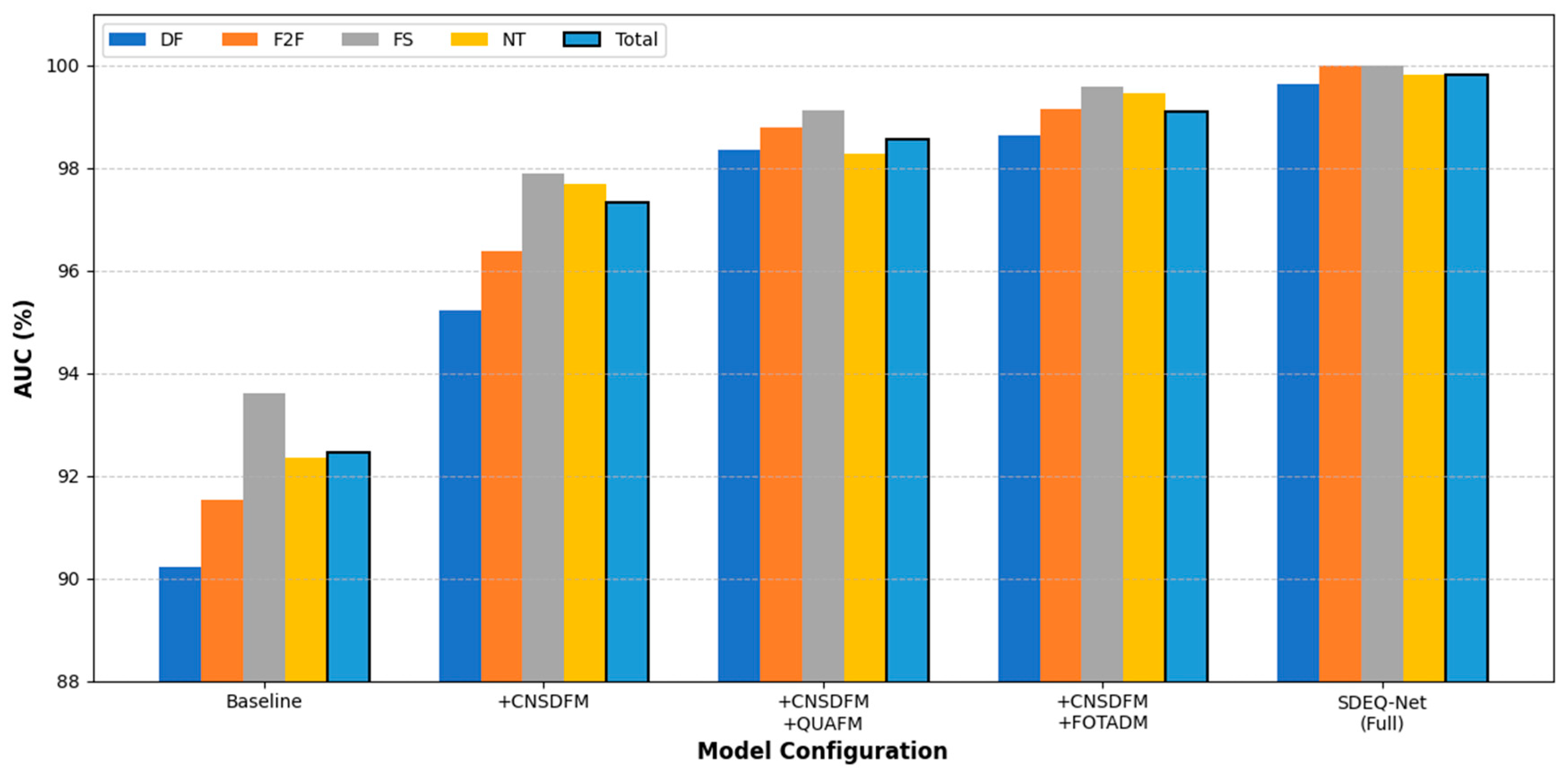 Table 3. When DF was used for training, the average AUC across the other three subsets reached 90.21%, representing the best performance among all methods. When trained on F2F, the average AUC was 92.61%, again outperforming all baseline models. Using FS as the training set yielded an average AUC of 92.00%, while training on NT achieved an average AUC of 91.18%, the best result in this setting as well. To provide a more intuitive understanding of the contribution of each module, we visualize the ablation results in