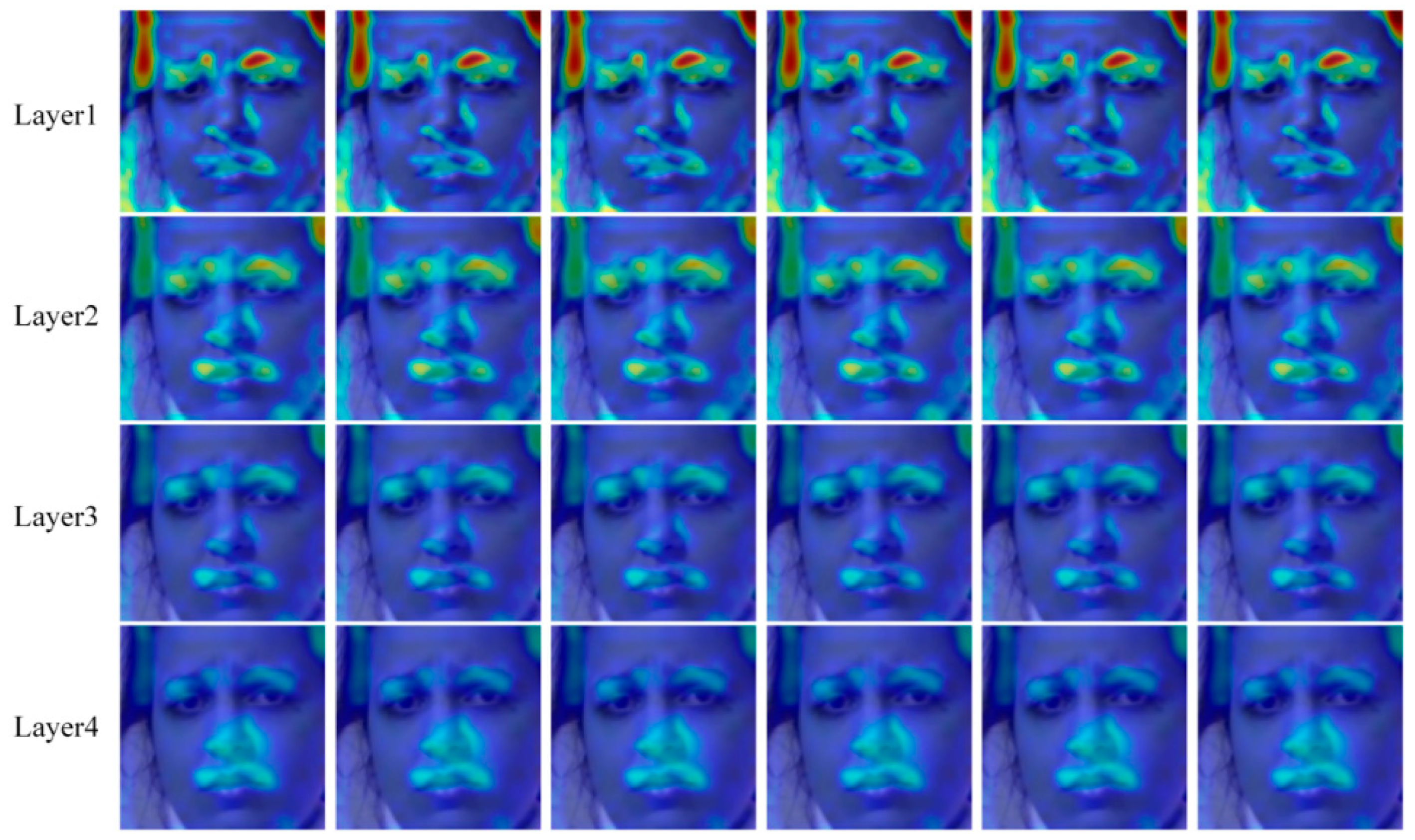 74]. At the deepest level (Layer4), attention becomes highly concentrated around the nasal alae and mouth corners, indicating that the model is capable of accurately localizing the most discriminative forged regions in high-level semantic space.