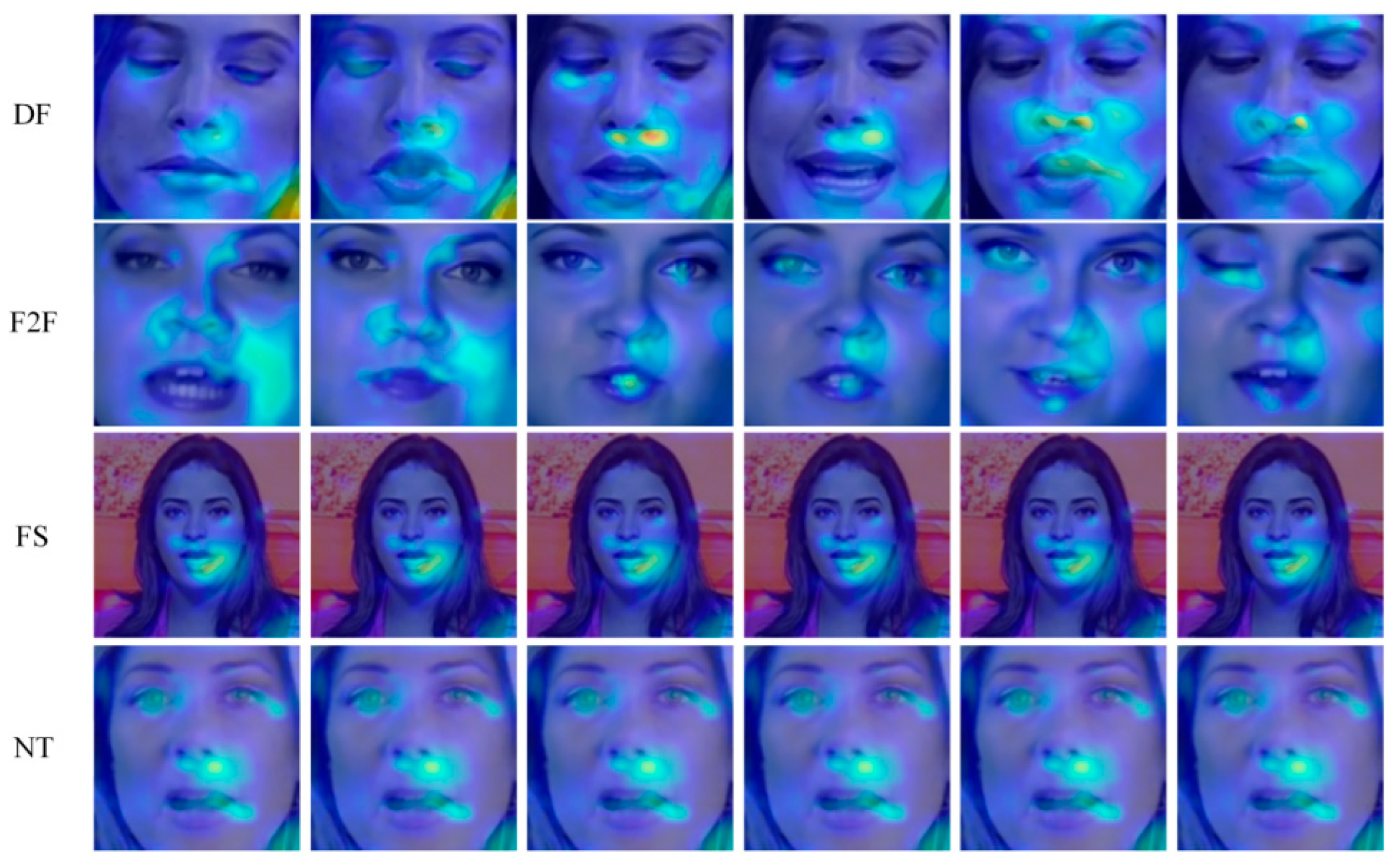 Figure 6 presents the visualization results from Layer1 to Layer4, clearly illustrating the evolution of the model’s focus as the network depth increases. At the shallow layer (Layer1), the model primarily responds to global facial structures and low-level texture features, with dispersed activation regions mostly located around the eyes and forehead. As the network deepens, the attention in Layer2 and Layer3 gradually shifts towards more representative local facial regions, such as the eye contour, nasal bridge, and mouth corners—regions that are inherently prone to forgery artifacts due to the technical limitations of deepfake generation pipelines. Specifically, the eye region frequently exhibits artifacts such as irregular pupil shapes, inconsistent corneal reflections between the two eyes, and unnatural blinking patterns, as generative models struggle to reproduce the physical and physiological constraints of human eyes [