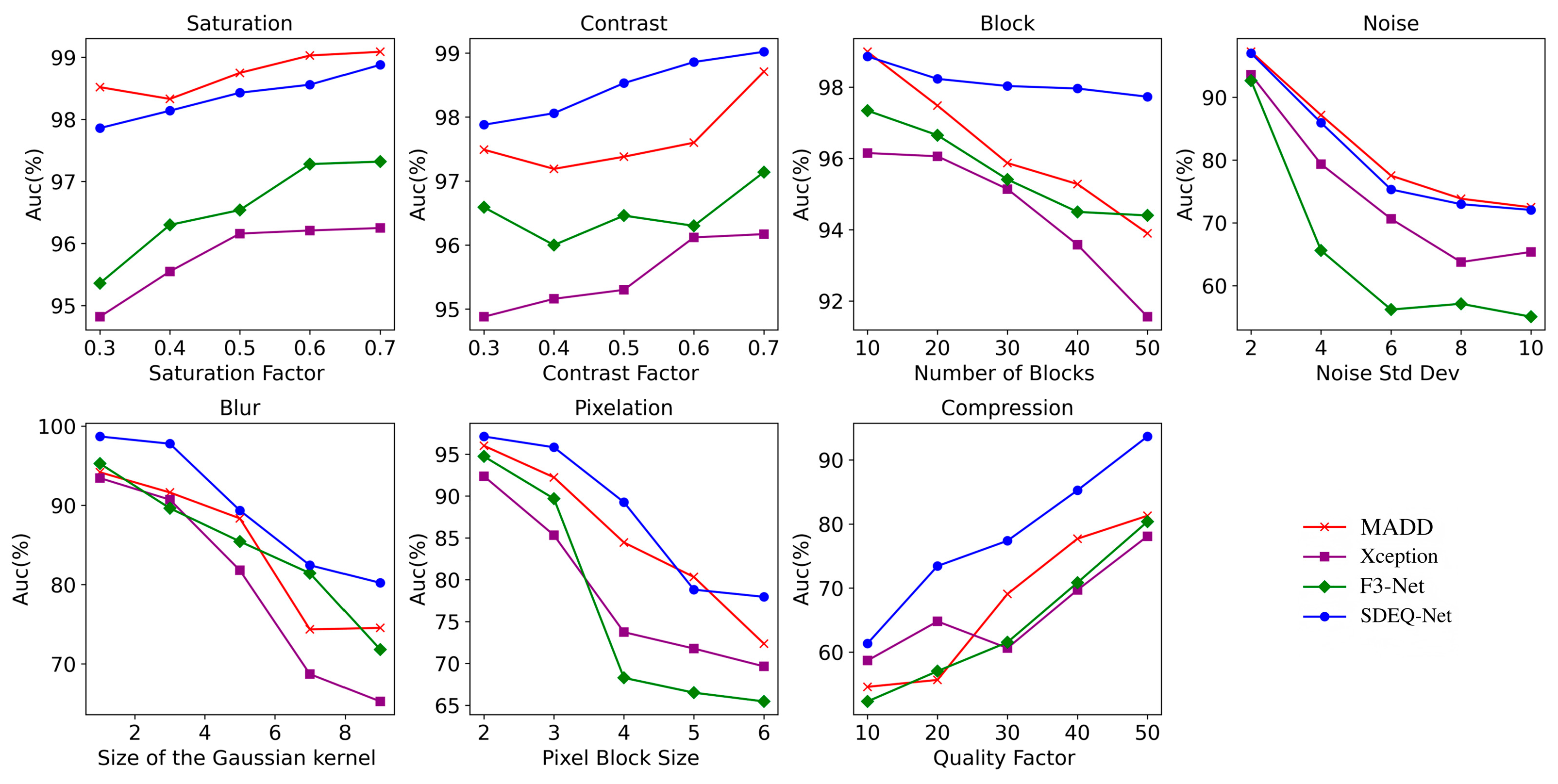 To assess the robustness of the proposed method under various visual degradation conditions, the model was trained on the FF++ (c23) dataset and systematically evaluated under seven types of degradation transformations: saturation variation, contrast variation, block occlusion, Gaussian noise, Gaussian blur, pixelation, and JPEG compression. Each degradation type was applied at five severity levels to simulate a spectrum of distortions ranging from mild to severe. The proposed method was compared against three representative deepfake detection models: F3-Net (frequency domain-based), Xception, and MADD (both spatial domain-based). The results are illustrated in