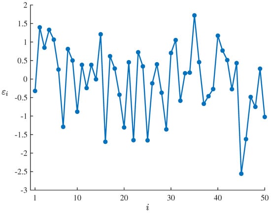 In this model, , , and are parameters to be estimated, and ε is an uncertain disturbance term, assumed to follow a normal uncertainty distribution with an expected value of 0 and a standard deviation of σ. For empirical analysis, we consider a dataset containing 50 sets of observations, presented in Table 1 and Figure 1, reflecting the observed relationship between the independent variable x and the response variable y.