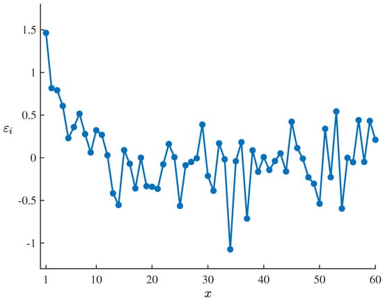In this model, , , , and are parameters to be estimated, and ε is an uncertain disturbance term, assumed to follow a normal uncertainty distribution with an expected value of 0 and a standard deviation of σ. For empirical analysis, we consider a dataset containing 60 sets of observations, presented in Table 4 and Figure 3, reflecting the observed relationship between the independent variable x and the response variable y.