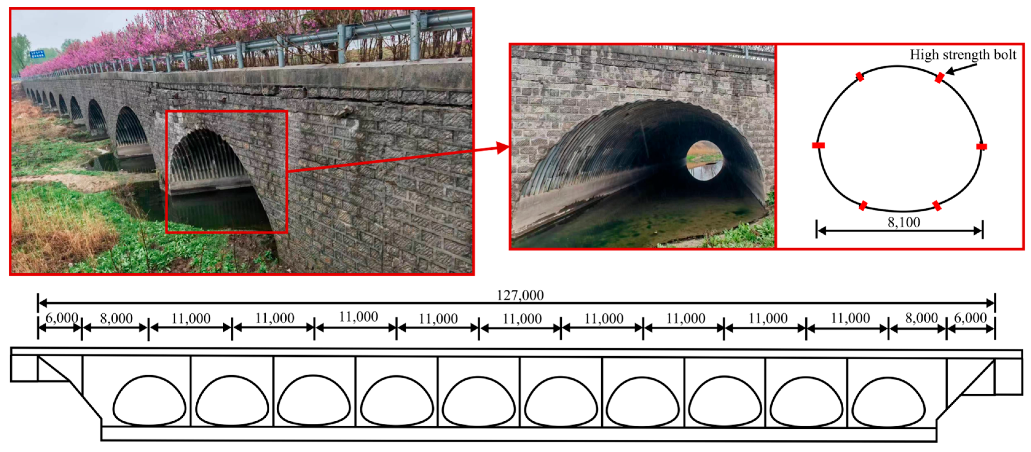 - Zhang, X.; Chen, K.; Lu, X.; Xu, G.; Chen, T. Constructional behavior of multi–span corrugated steel arch culverts stiffened by concrete rings. J. Constr. Steel Res. 2024, 218, 108751. [Google Scholar] [CrossRef]