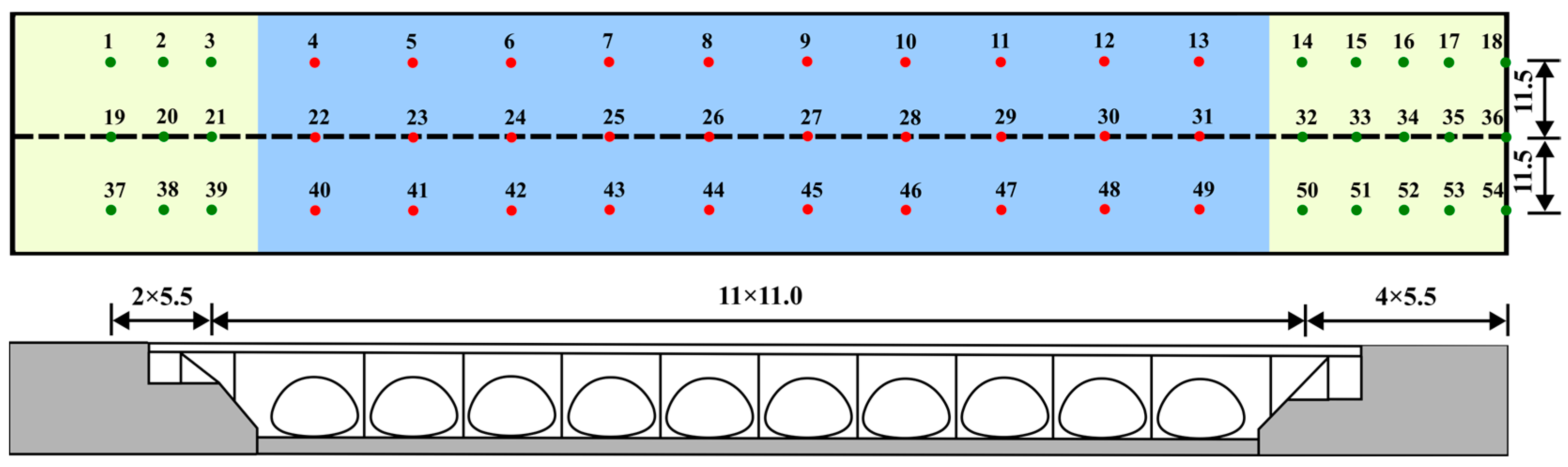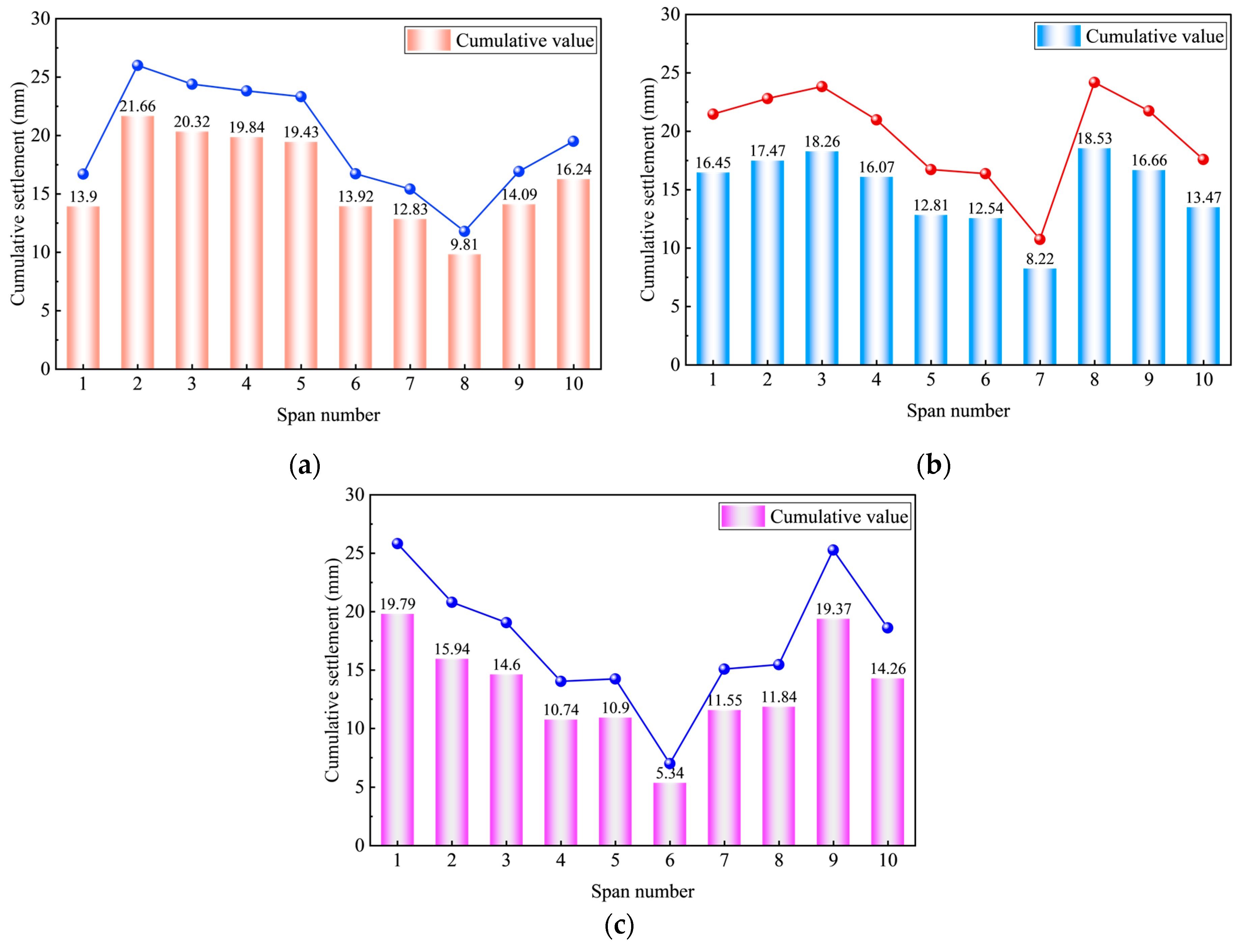 - Field monitoring results show that the settlement of the edge spans is significantly greater than that of the mid-span. Over one year, the maximum cumulative settlement reached 21.66 mm at point 12 in span 2, while the minimum settlement was 5.34 mm at point 44 in span 6.