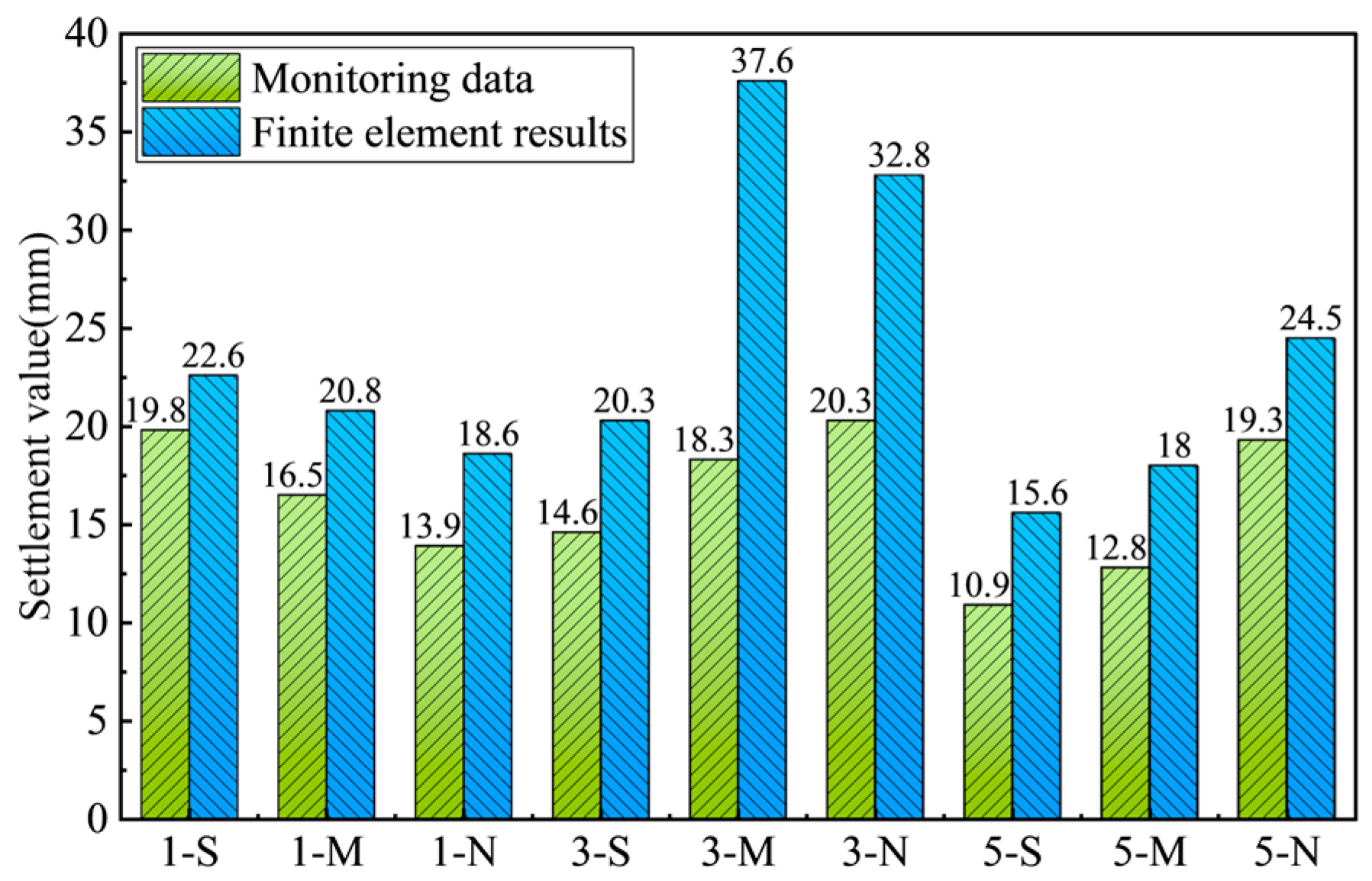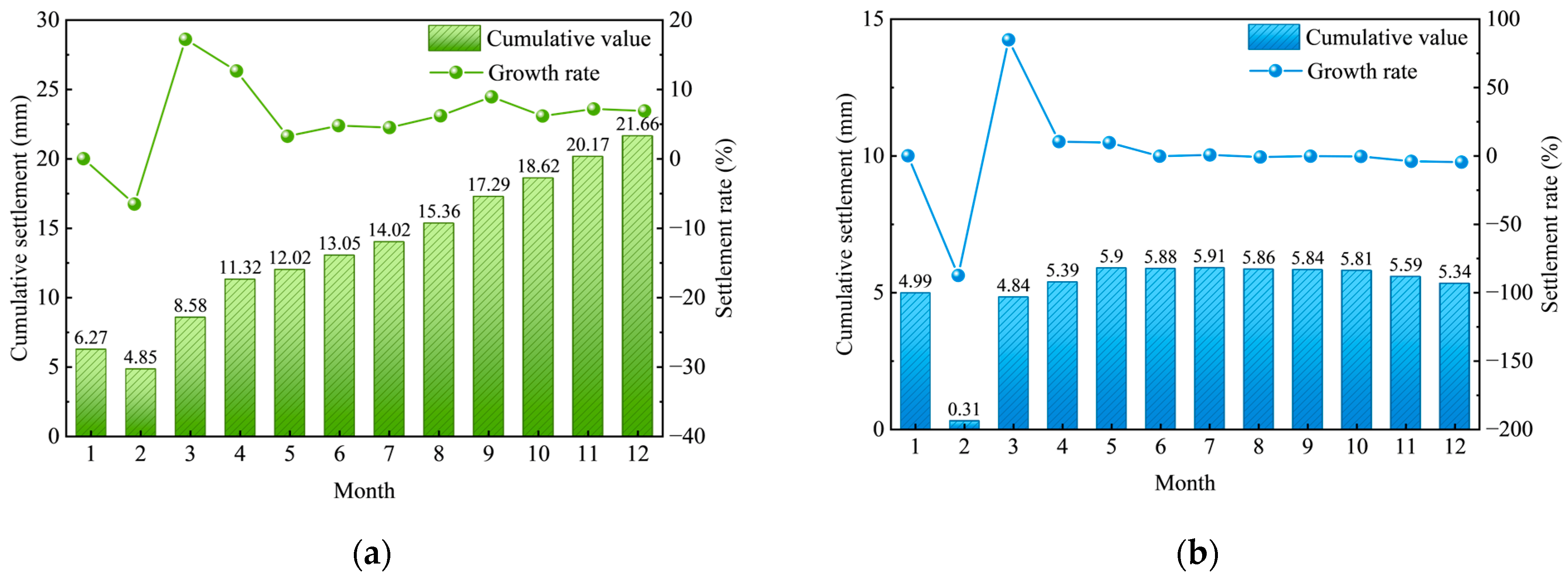 - The settlement data indicate that during the early stage of monitoring (Months 1–3), the growth rate of structural settlement was rapid, with a maximum monthly increase of approximately 30 percent. The settlement rate then gradually decreased and stabilized at about 10 percent per month.