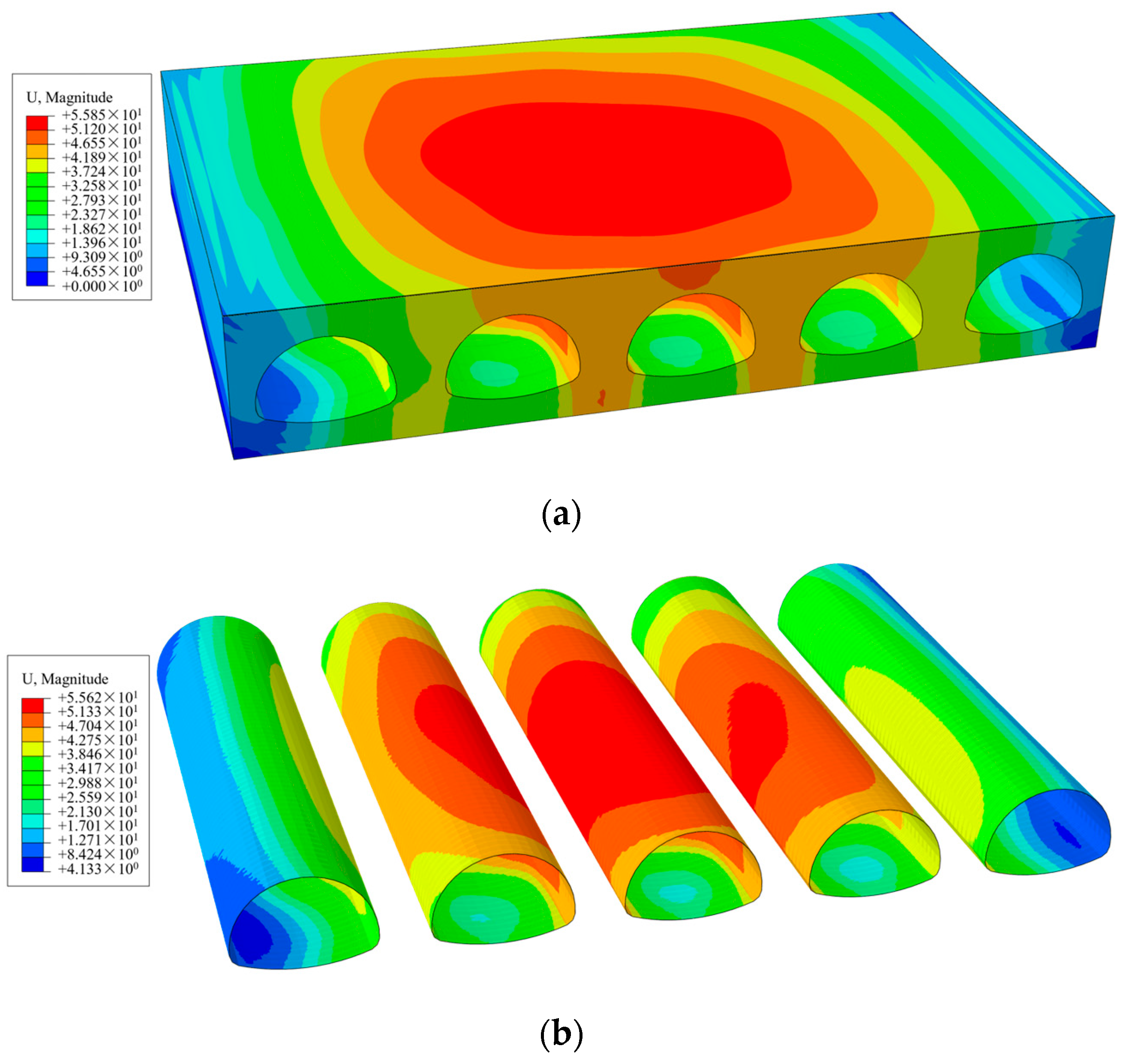 - Compared with ideal foundation conditions, differential settlement increased the maximum stress in the corrugated steel pipe from 86.39 MPa to 296.20 MPa and increased structural deformation from 6.10 mm to 55.54 mm. The stress increased by a factor of 3.4, and the settlement deformation increased by a factor of 9.1. Differential foundation settlement in mining subsidence areas poses a severe threat to the long-term safety of corrugated steel pipe arch bridges.