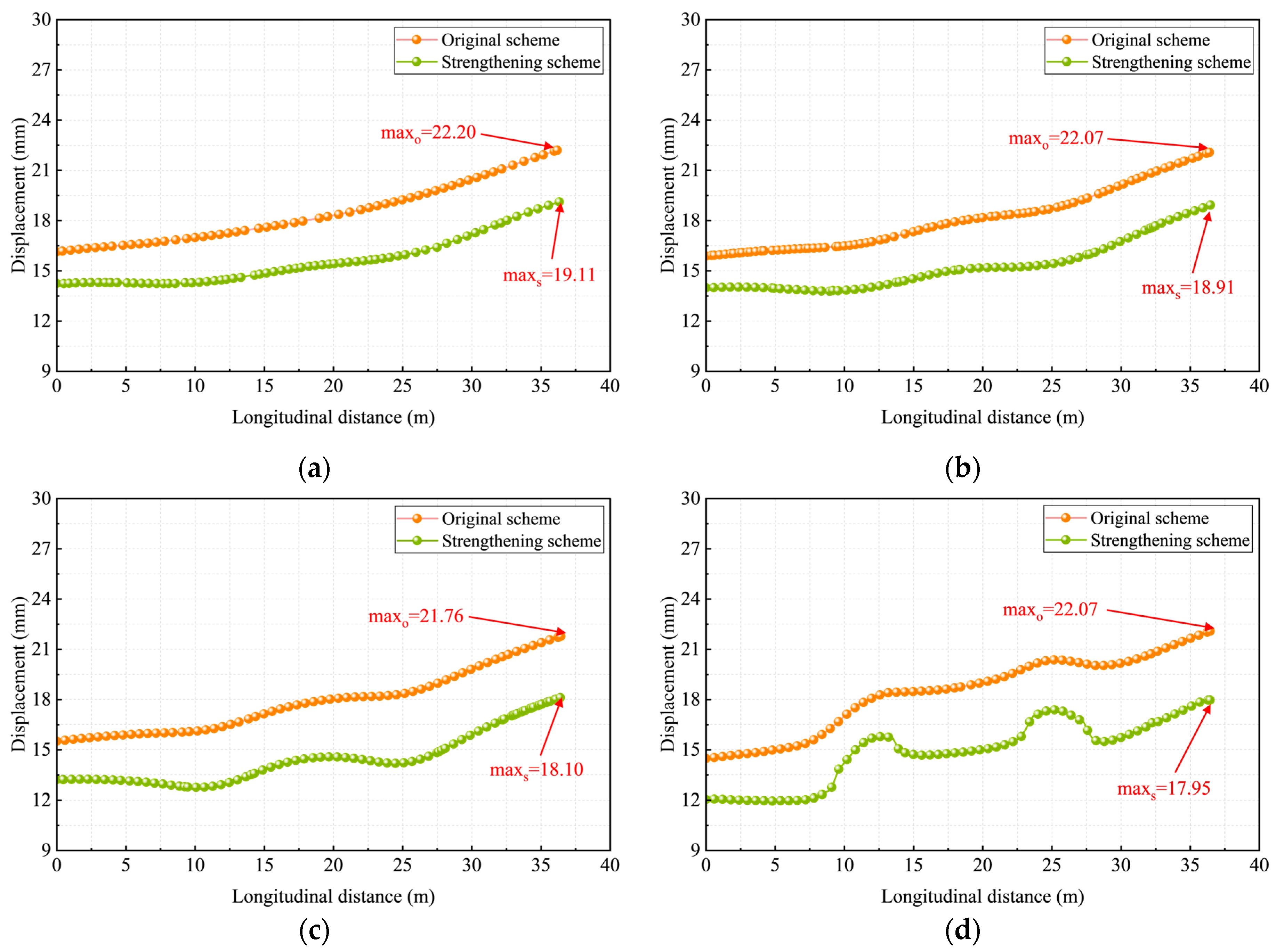 - Applying a 100 mm thick internal concrete lining effectively suppresses the settlement-induced deformation of the corrugated steel pipe. After reinforcement, deformation at typical cross-sections is reduced by 10~20 percent, with lower deformation peaks and a more uniform distribution. This improvement demonstrates that the reinforcement enhances overall stiffness and stability without altering the structural load-transfer mechanism.