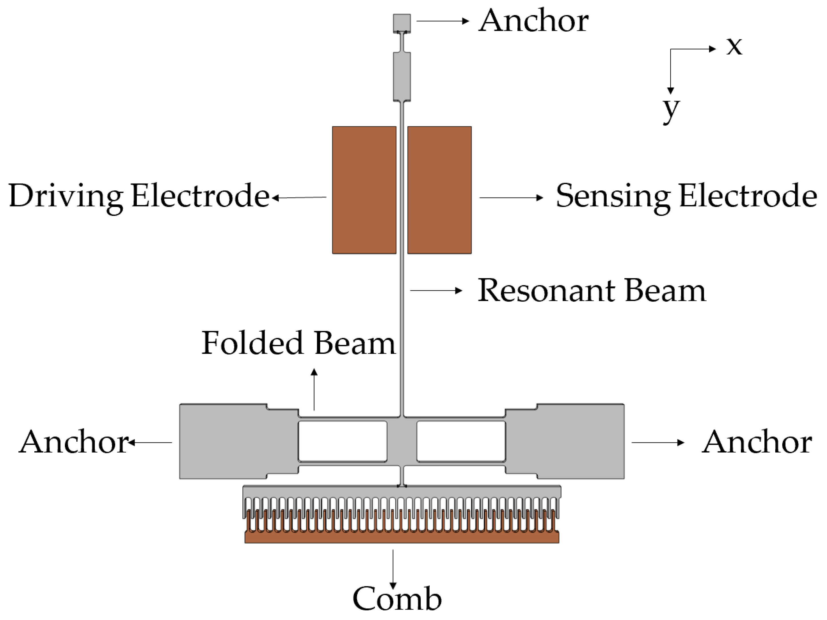 Figure 1, mainly consisting of driving electrodes, sensing electrodes, a resonant beam, fixed anchors, and other components. And the structural parameters are shown in