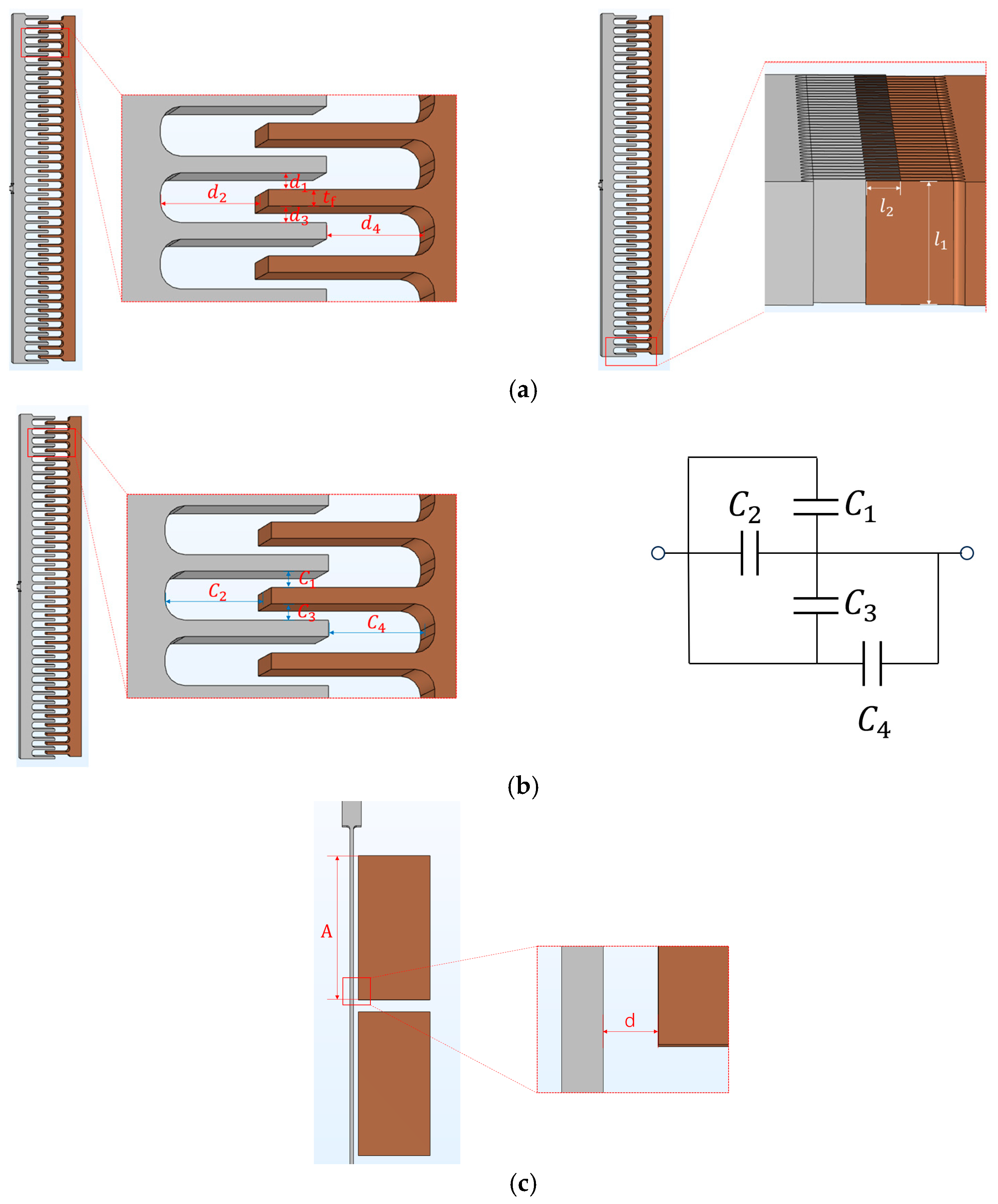 Table 1. The sensing electrodes and lateral driving electrodes adopt parallel-plate capacitors; to increase the effective capacitance area between electrode plates, the axial driving electrodes are designed in a comb-shaped structure. This design concept utilizes the fact that the sensitivity of sensors can be enhanced by the coming capacitor structure [