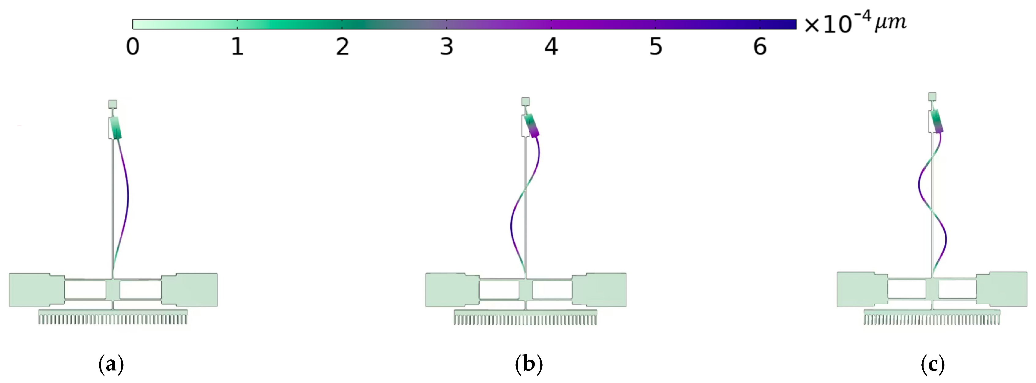 Figure 4, the simulation results are presented: the modal shapes of the first-order, second-order, and third-order modes, where the colors represent the displacement magnitude relative to the equilibrium position.
