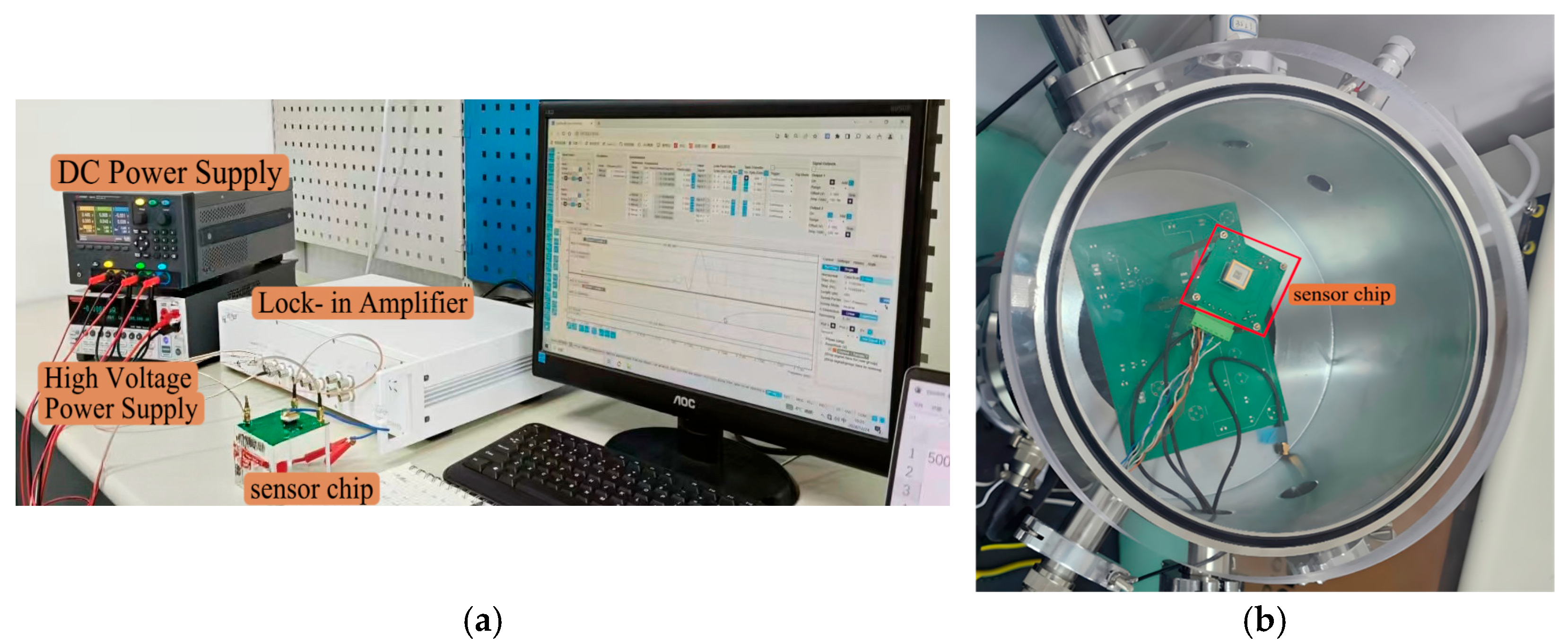 Figure 5. This system consists of a vacuum pump for providing a vacuum experimental environment, a DC power supply, a lock-in amplifier from Zurich Instruments, a data acquisition and display computer, a sensor chip, and several connecting wires. The manufacturing of sensor chips is similar to the reported research [
