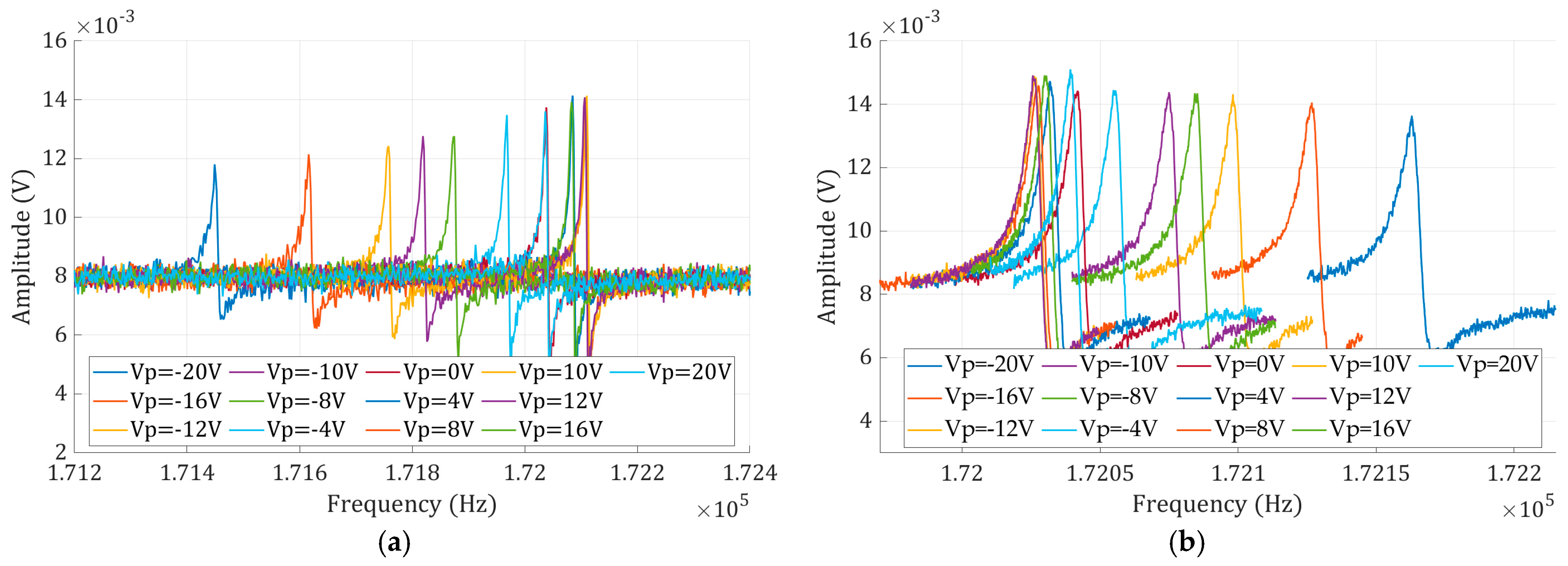 was adjusted from −20 V to +20 V. The amplitude-frequency curves at different