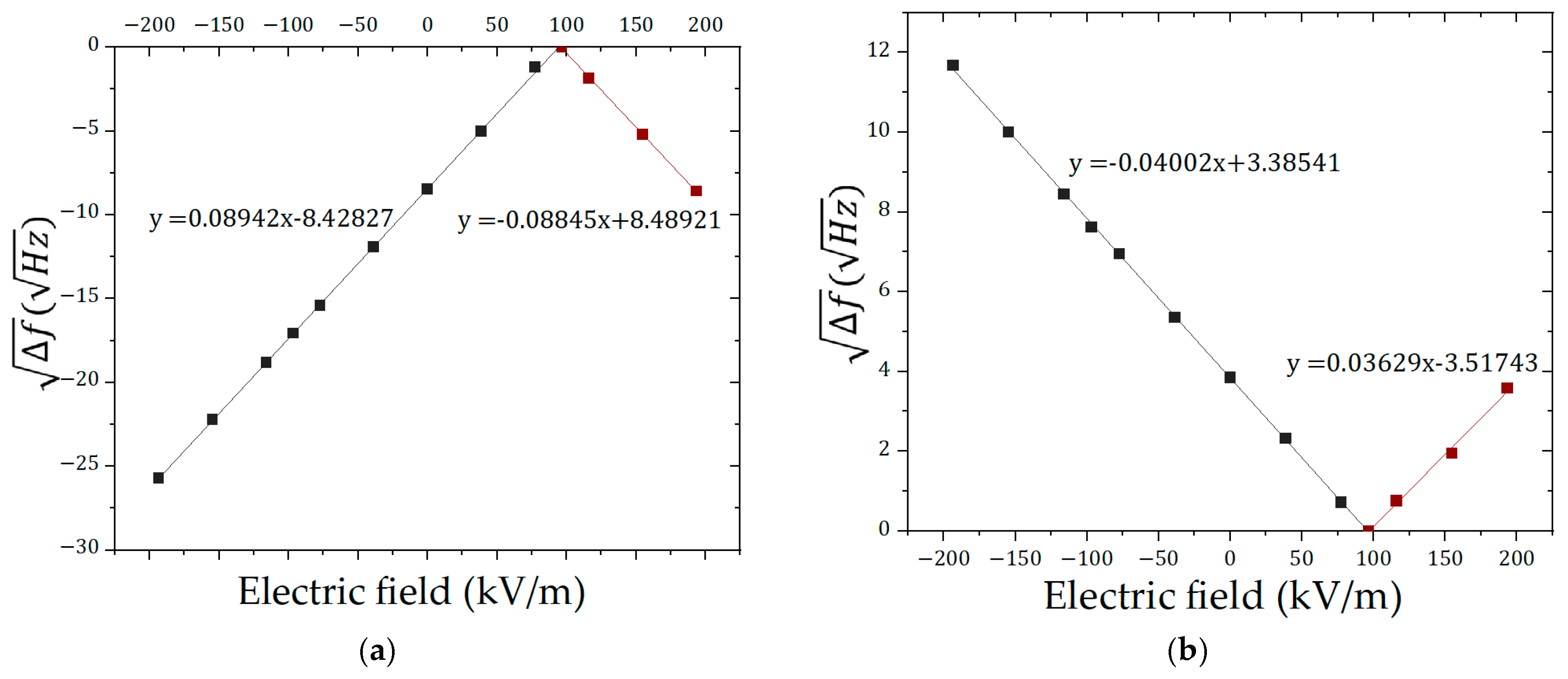 were selected. Nine sets of measurements were taken for each direction, and the sensitivity for each set was calculated, defined as the change in the square root of frequency per unit change in electric field strength. Using the calibrated voltage-to-electric field conversion factor, the electric field strength corresponding to each perturbation voltage was determined. The sensitivity curve for