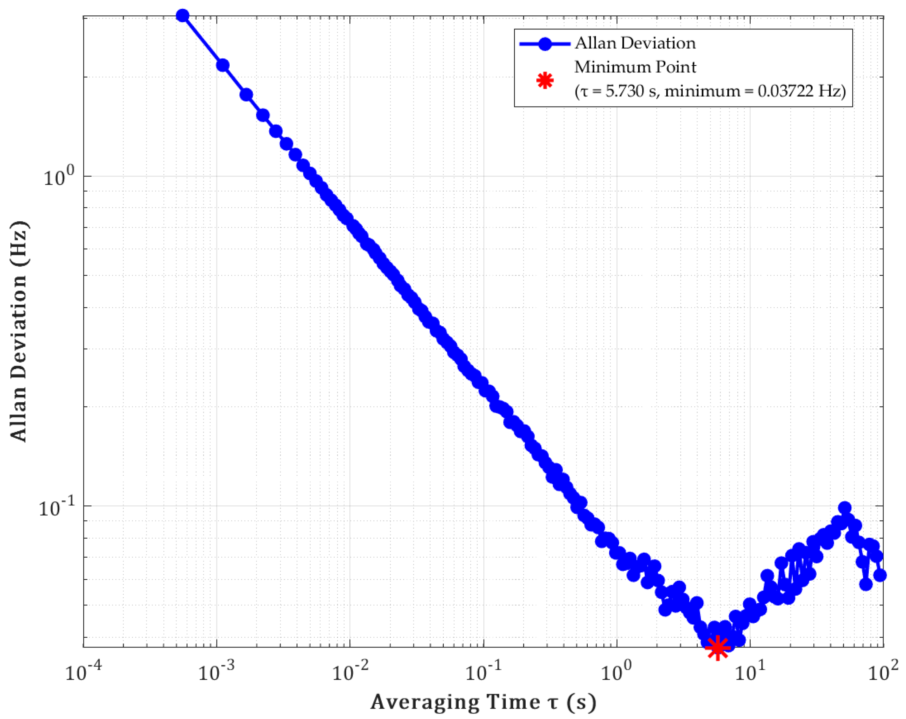 7 V. The figure shows that the sensor in this study exhibits excellent short-term stability in the time stability test, with the Allan variance reaching a minimum of 0.03722 Hz at τ = 5.730 s. This indicates that the sensor has superior frequency stability and internal noise at this time scale, making it suitable for medium and short-term high-precision electric field measurements on the order of seconds. However, the long-term stability needs to be improved. This can be addressed in future research by optimizing the signal conditioning circuit [