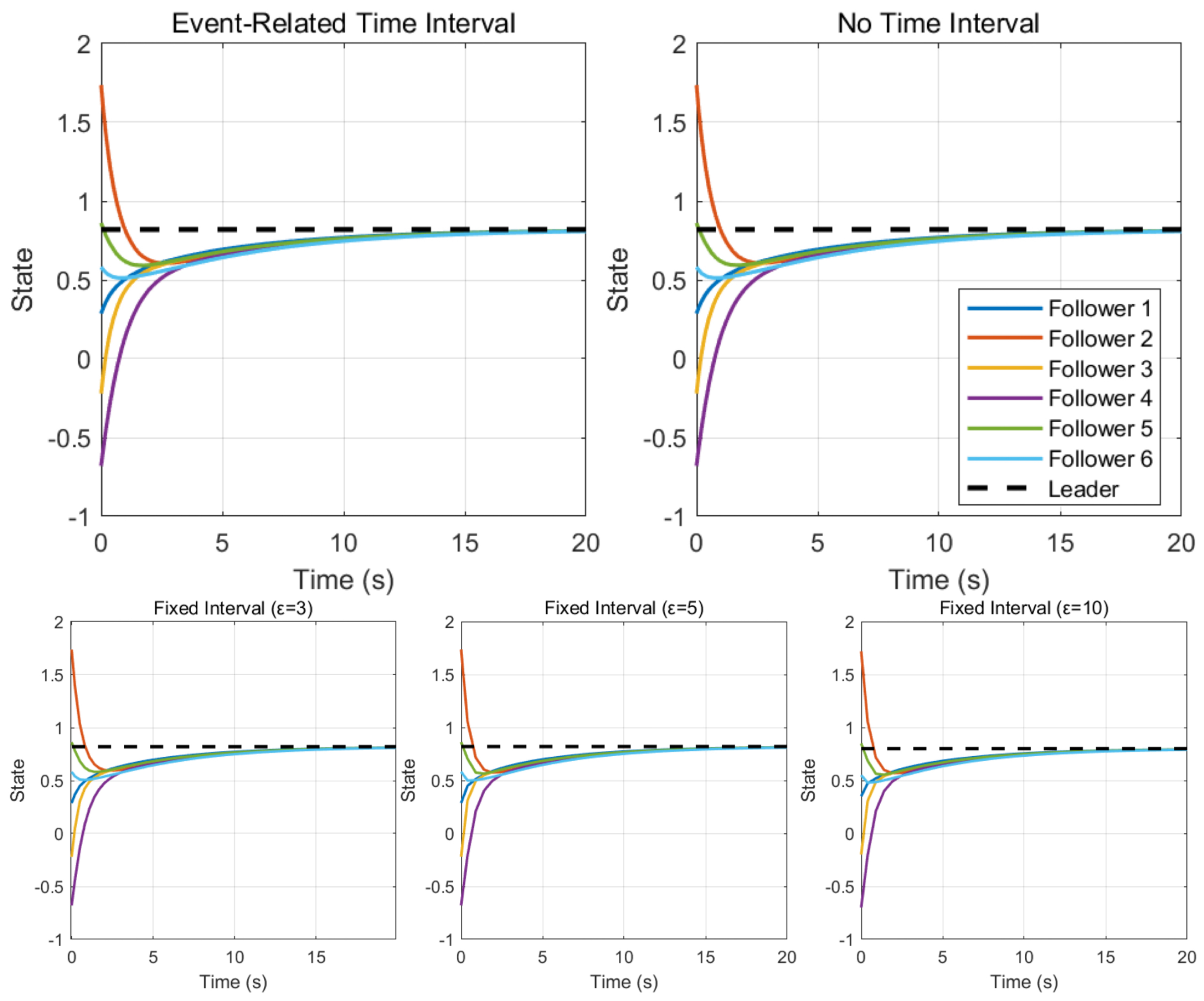 Figure 2 that, for the MAS with an event-related time interval or fixed-length time interval, the states of all followers eventually converge uniformly to the state of the leader.