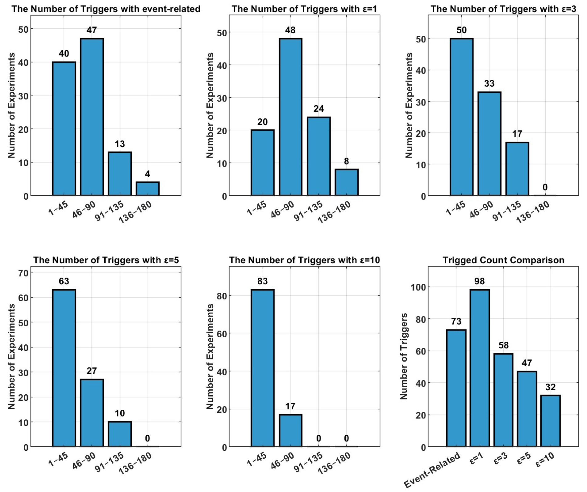 Figure 3 show the distribution of the number of triggers in multiple experiments, which are grouped by certain intervals. The sixth sub-figure in