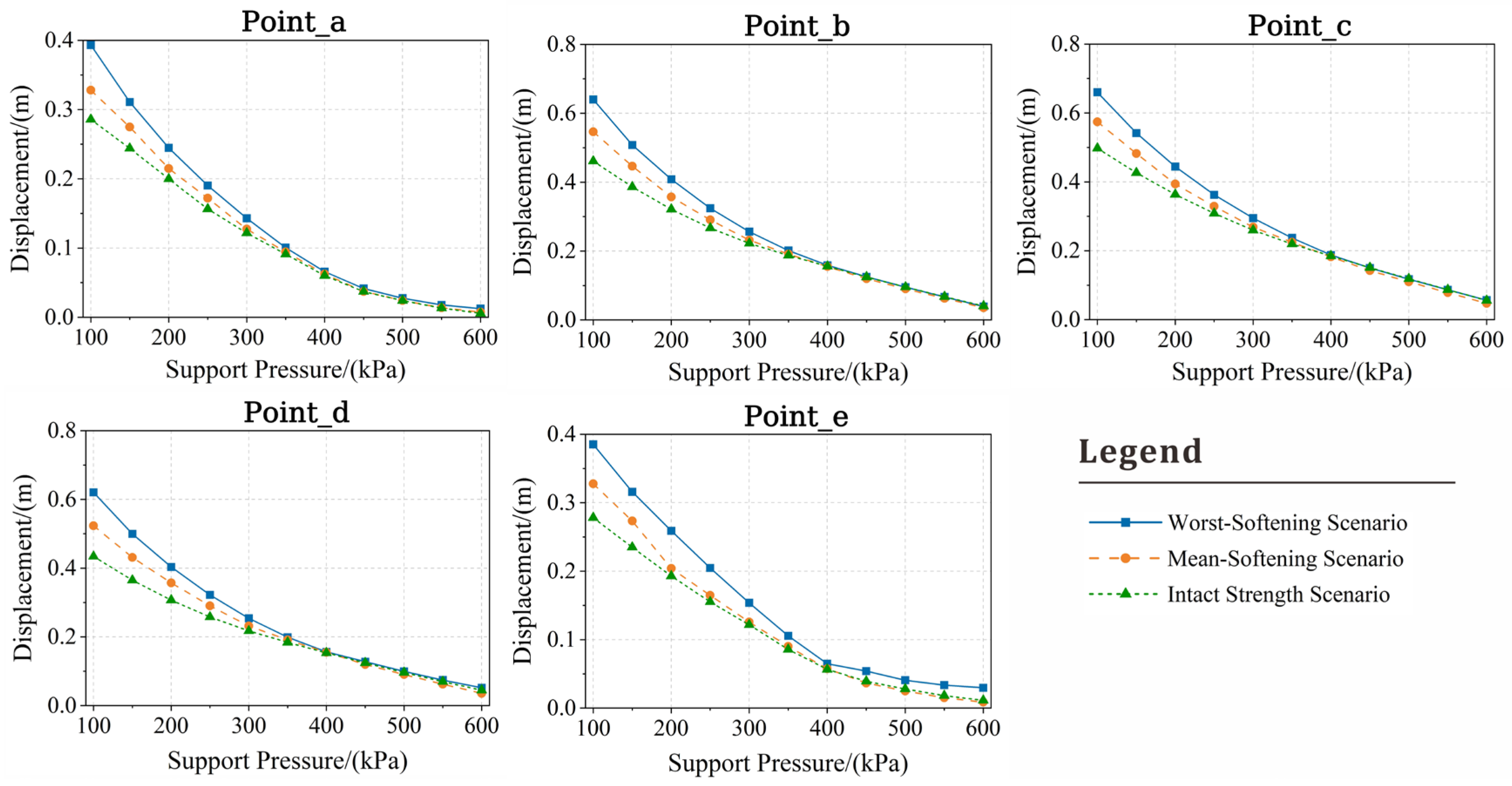 - The impact of soil softening exhibits a strong dependency on the support pressure. During the high support pressure stage, the effects of softening are inhibited by high effective confining pressure. However, the deformation rate in the worst-softening scenario increases by 53.8% compared to the intact strength scenario within the low support pressure stage. This indicates that saturated sand exhibits extremely high sensitivity to the softening effect at low stress levels.