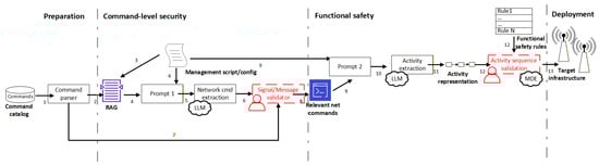 Functional safety/reliability validation (11–12): Management activity sequences are represented in an MDE environment as formal models (such as state machines, sequence diagrams, activity or domain-specific models). In our approach, PlantUML activity diagrams are converted into JSON using model-to-model transformation for rule checking. Ordering constraints are then verified. For this purpose, we support rules of the form ai before/after aj, which specifies that activity ai must occur earlier/later in the execution sequence than activity aj. These rules are evaluated by identifying the corresponding activities in the modeled event sequence and comparing their sequence indices to verify compliance. Security and reliability rules (Rule 1 … Rule N) represent domain best practices and may be defined manually or generated with LLM support, as described in [16,17]. Such before/after constraints are commonly used to enforce domain best practices, for example, ensuring that authentication precedes privilege modification, validation occurs before deployment, or rollback actions follow failure detection in any analyzed management activity sequence. Despite their simplicity, these rules provide an effective and explainable mechanism for detecting unsafe or inconsistent management behaviors at design time.