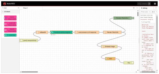 Node-RED is an open-source, flow-based programming tool that aims to make connection of hardware devices, APIs, and online services easier. Instead of writing lots of code, users build applications by wiring together visual “node” elements in a browser-based editor. Each node represents a specific task—such as reading data from a sensor, calling a web API, processing information, or sending messages—and data flows between them in real time. Node-RED is especially popular in IoT (Internet of Things) projects because it works well with devices like Raspberry Pi, microcontrollers, and cloud services. It supports many communication protocols (such as HTTP and MQTT) and has a large community library of reusable nodes, which makes development faster and more flexible. Overall, Node-RED is valued for its simplicity, visual clarity, and ability to rapidly prototype and deploy integrations, from smart home systems to data dashboards and automation workflows. Furthermore, node-red-contrib-ai-intent is a Node-RED extension consisting of a set of nodes designed to enhance automation workflows with AI and intent-based interactions. The package allows users to register custom intents and enables Large Language Model (LLM)-powered chatbot capabilities directly within Node-RED flows. It includes nodes for interacting with LLMs (such as OpenAI, Gemini, or local AI implementations) and workflows that can trigger registered intents dynamically. A screenshot of the environment showing the activity diagram construction workflow is given in Figure 3.