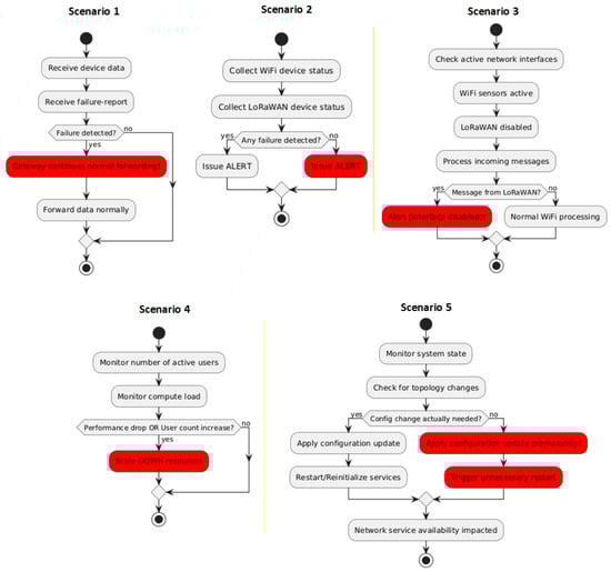 To demonstrate proof-of-concept for reliability assurance in networked IoT environments, we consider several experimental scenarios based on an IoT edge-gateway system that covers two main aspects: failure handling and maintaining Quality of Service (QoS). When it comes to failure handling, it must trigger an alert to the network operations center (NOC) when either the Wi-Fi sensor network or the LoRaWAN network reports a critical device failure. On the other side, it also aims to ensure that infrastructure works seamlessly under varying conditions, including an increasing number of users and performance drops imposed by changes in the environment. Each scenario is considered from the edge-controller decision-making module and contains functional flaws that should be discovered by the proposed LLM-empowered framework.