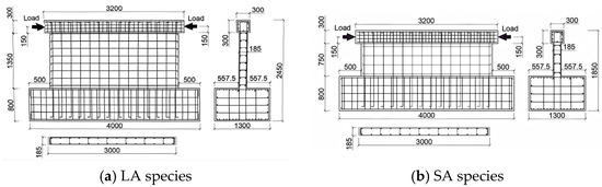 In this study, the specimens are categorized into Group L and Group S, primarily distinguished by their sectional height. Group L specimens feature a relatively larger shear span ratio (λ ≈ 0.5), whereas Group S specimens have a smaller shear span ratio (λ ≈ 0.3). This design aims to investigate the independent influence of geometric dimensions—particularly the shear span ratio—on the failure modes and seismic performance of low-rise shear walls, as well as its coupling effect with reinforcement ratios, under comparable reinforcement conditions. As shown in Table 1, each group includes three levels of reinforcement ratio (low, medium, and high), enabling the separation and comparison of geometric effects and material strengthening effects. Six groups of squat shear wall specimens with different reinforcement ratio parameters were experimentally tested. These specimens were classified into Group L and Group S according to their cross-sectional dimensions. Within each group, the three specimens share an identical ratio of horizontal to vertical reinforcement, while each specimen has a unique total reinforcement ratio. The detailed design specifications are presented in Table 1 and Figure 1.