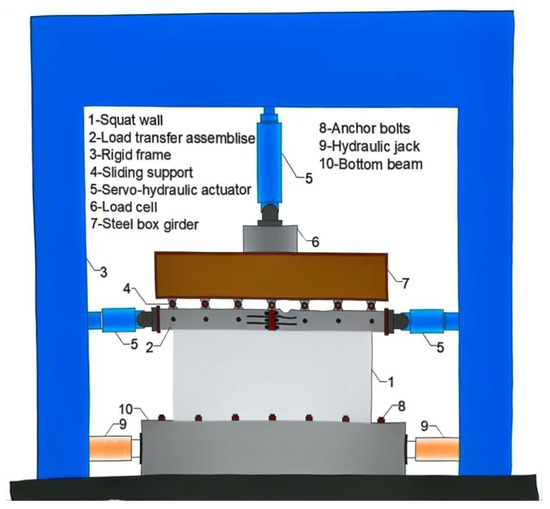 All specimens were engineered to fail in a shear-dominated manner. Shear connectors with a diameter of 10 mm were arranged on both the flanges and webs of the steel components within the shear wall, aiming to guarantee efficient shear transfer between the concrete and steel elements. Jacks installed at the bottom of the shear wall were employed to rectify installation errors and attain precise positioning (refer to Figure 2). Additionally, short steel bars were welded to the steel members in the foundation zone to improve the anchoring performance.