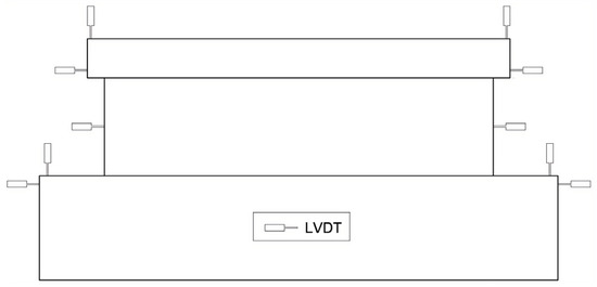 To acquire the strain and displacement data during the entire test, each specimen was equipped with a sufficient quantity of internal strain gauges and external measurement apparatuses. Linear variable differential transformers (LVDTs) were utilized to monitor the top displacement, flexural deformation, shear deformation, and axial deformation of the shear wall. As depicted in Figure 4, internal strain gauges were employed to measure the strains in the steel bars and steel components; these gauges, installed on specialized brackets, were arranged on the rear surface of the wall.