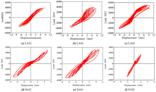 By measuring the horizontal load exerted at the top of each specimen and the corresponding horizontal displacement, the horizontal load–displacement hysteresis curve can be obtained. This curve is able to portray the entire evolutionary process of structural deformation and displacement, thereby offering a foundation for assessing the seismic performance of the structure. The hysteresis curves of the three groups of shear wall specimens are shown in Figure 5.