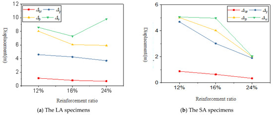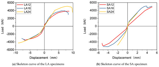 When the load dropped beyond the peak value, the specimens in Group SA experienced continuous displacement growth during the load-declining stage, suggesting that severe damage had occurred to the structure. Conversely, the skeleton curves of Group LA specimens showed no significant descending branch before failure, which represents a sudden failure mode; this finding is consistent with the brittle failure phenomenon observed during the experiment. Overall, increasing the reinforcement ratio can effectively improve the ductility of the specimens and exert a significant impact on their failure modes.