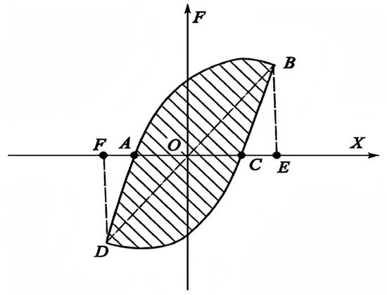 Here, SABC and SCD respectively signify the areas encircled by the upper loop (A-B-C) and the lower loop (C-D-A) within one full cycle of the load–displacement hysteresis curve, which represent the energy dissipated by the structure during a single loading cycle. SOBE and SODF refer to the areas of the triangles formed by connecting the vertices (B, D) of the corresponding half-loops to the origin (O) of the coordinate system, which represent the theoretical elastic strain energy at the given amplitude, as depicted in Figure 7.