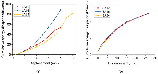 The curves of energy dissipation of specimens. (a) The curve of cumulative energy dissipation of LA specimens. (b) The curve of cumulative energy dissipation of SA specimens.