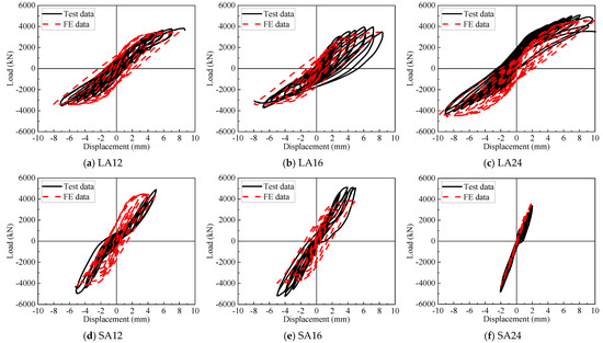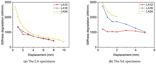 In contrast, the skeleton curves of Specimens SA16, SA12, and SA24 showed no obvious descending branch or curvature inflection points, remaining approximately linear with minimal curvature variation. This phenomenon implied that the specimens underwent slight stiffness degradation, and their failure occurred without obvious precursors. Additionally, the peak load and ultimate load of these specimens were relatively close, which reflected their inferior ductility and energy dissipation performance.