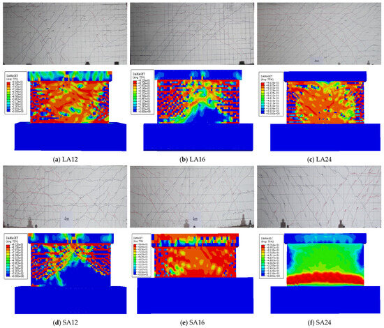 From Figure 8, it can be discerned that the energy dissipation coefficient of each specimen undergoes a gradual increase at the initial stage. As the horizontal displacement increases and the specimens subsequently enter the plastic stage, both the energy dissipation coefficient and the energy dissipation capacity display a tendency of rapid growth. The cumulative energy dissipation growth rate of the specimens with the highest reinforcement ratio (SA24 and LA24) is found to be lower than that of the specimens in the other two groups. However, the maximum cumulative energy dissipation is achieved by the specimens with a medium reinforcement ratio (SA16 and LA16), which suggests that the reinforcement ratio exhibits a non-linear influence on the cumulative energy dissipation of squat shear walls. An optimal range (around 1.6% in this study) appears to exist, maximizing the energy dissipation capacity. Both excessively low and very high reinforcement ratios may not lead to the best cumulative energy dissipation, the former due to premature strength degradation, and the latter possibly due to restricted crack development and deformation capacity, especially in walls with very low aspect ratios (e.g., SA group).