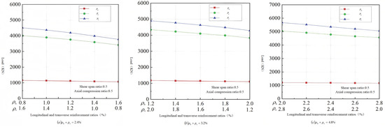 As shown in Figure 5, all hysteresis curves displayed an approximately linear response at the initial loading stage, suggesting that all specimens remained in the elastic state during this period. After the initiation of cracks in the shear walls, the structural stiffness started to gradually degrade as the lateral displacement increased. During the loading process, the load-bearing capacity in the first loading cycle was higher than that in subsequent cycles, which indicated a progressive reduction in the structural strength, stiffness, and load-bearing capacity. Additionally, as the reinforcement ratio of the squat shear walls increased, both the number of load cycles endured and the ultimate displacement attained showed an upward tendency, demonstrating that the deformation resistance of squat shear walls was significantly improved with a higher reinforcement ratio.