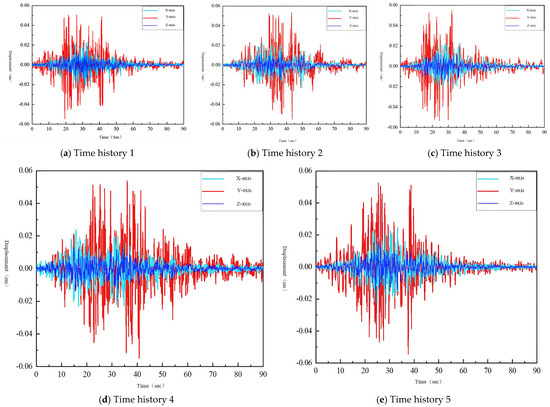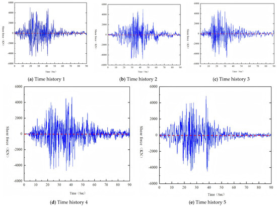 A seismic response analysis was conducted on the finite-element model of the nuclear island structure under three-dimensional seismic input. This analysis yielded the time-history curves of the shear force (as shown in Figure 21) and the time-history curves of the inter-story displacement (as shown in Figure 22) of the nuclear island shear walls.