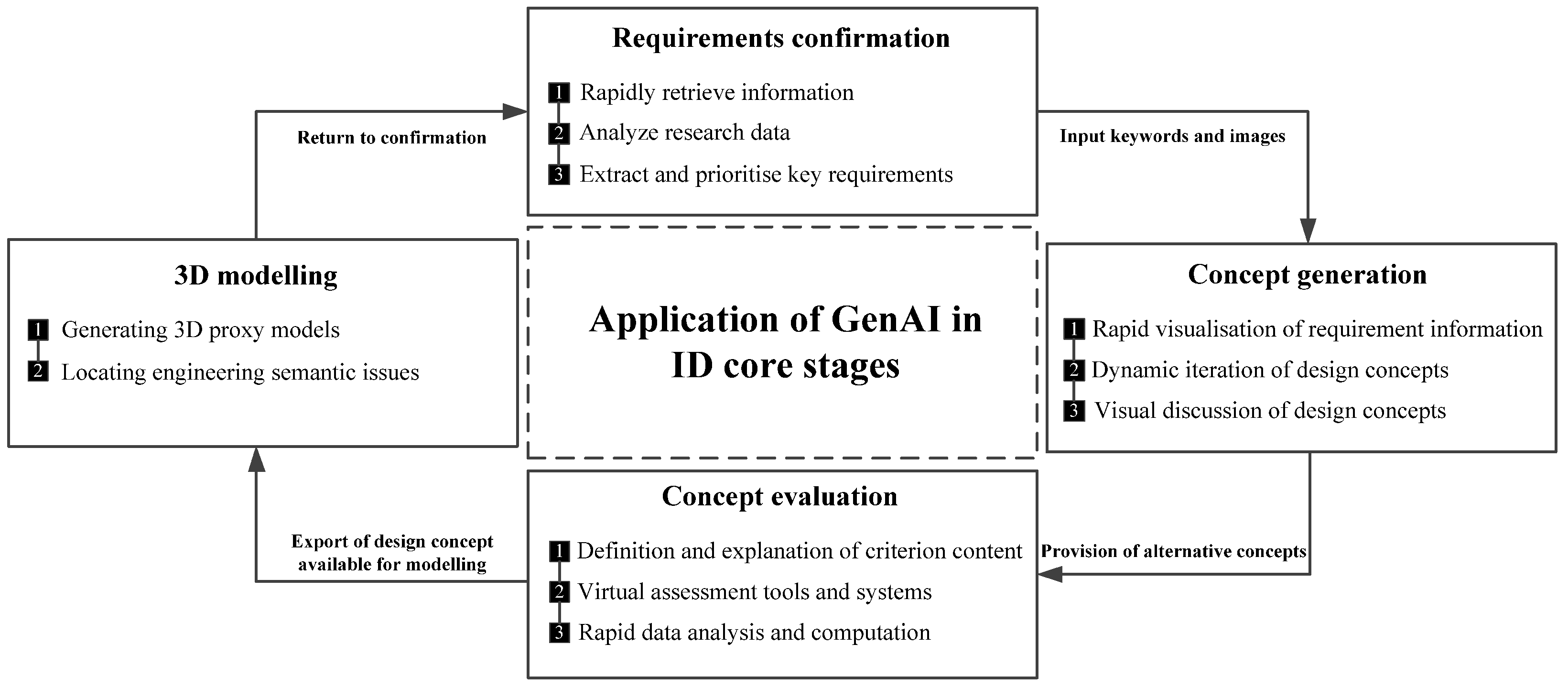 - We propose the GID-HGCC framework spanning requirements confirmation, concept generation, concept evaluation, and 3D modeling, explicitly defining stage-wise human decision authority and GenAI generation/assistance roles to make co-creation operational rather than tool-centric.