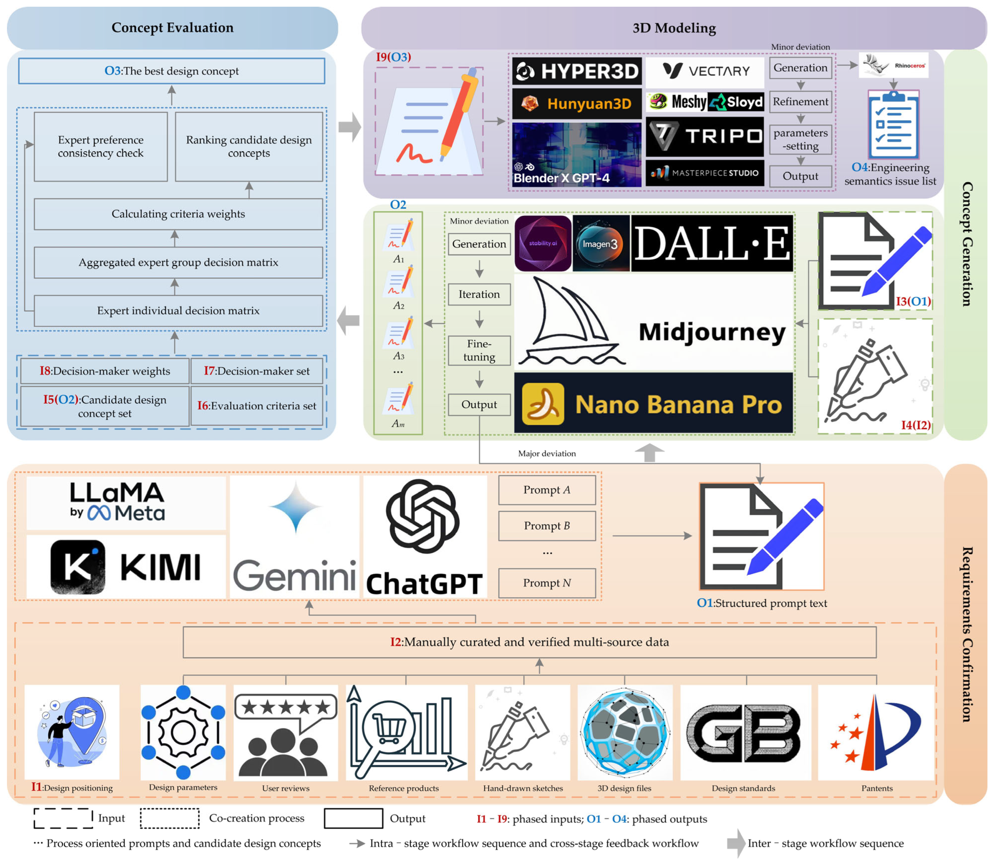 | Requirements confirmation | The research evidence is summarized to form a requirements document primarily in natural language, with key constraints not explicitly expressed. | LLMs are used to transform manually reviewed multi-source data into structured semantic text of requirements under constraints. |