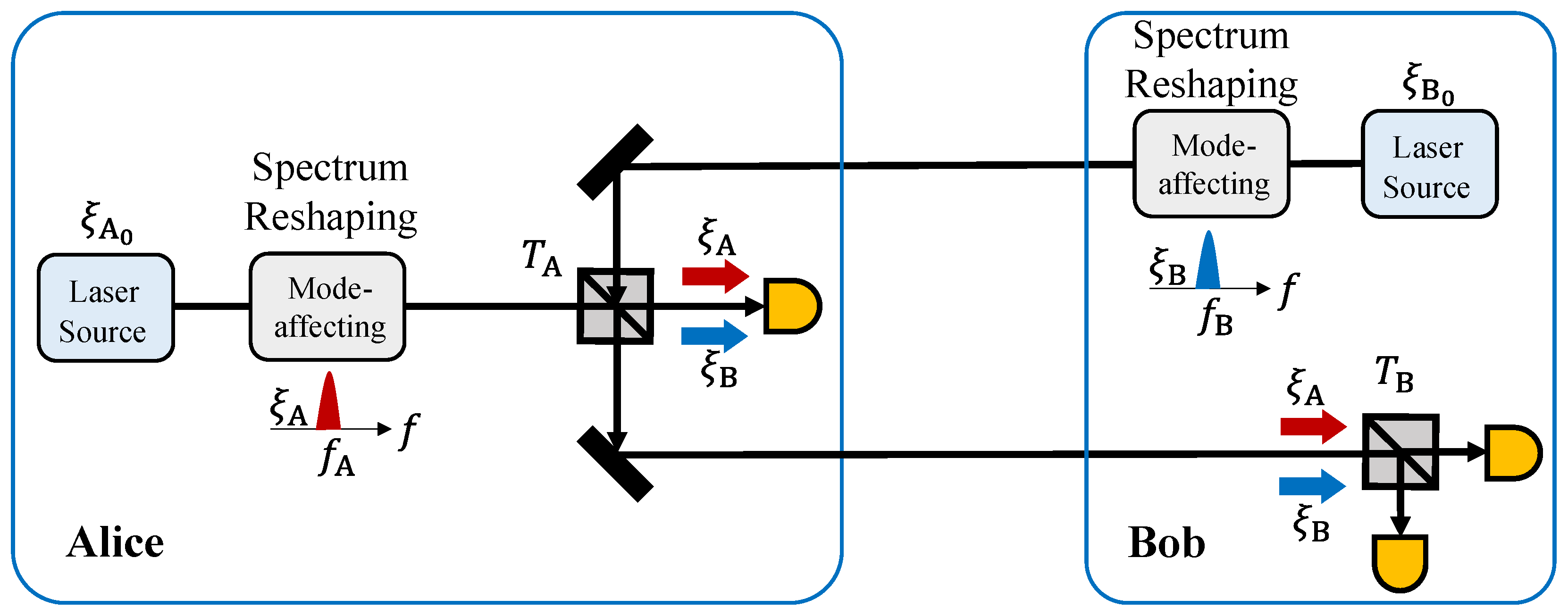 The detection processes in the two-way protocol can be categorized into two types. One corresponds to the detection of quantum states prepared at one side and transmitted through the optical fiber channel to the remote receiver. The other corresponds to the detection of quantum states prepared and measured locally at the same station. Optical signals propagating over long-distance quantum channels (Bob-to-Alice and Alice-to-Bob) typically suffer significantly higher wavefront distortion and temporal broadening compared to the local paths (Alice-to-Alice or Bob-to-Bob).