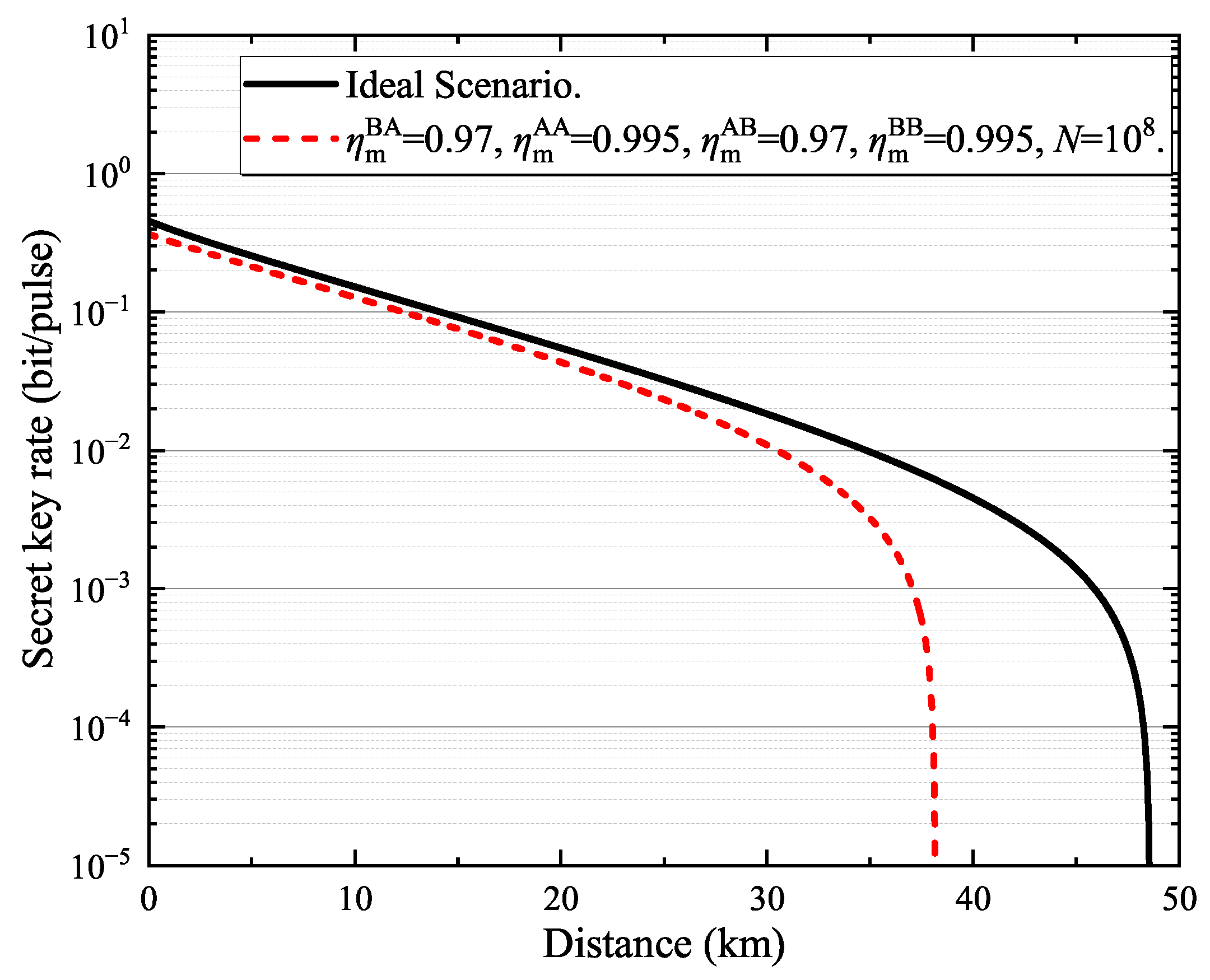 Figure 3, the black solid line represents the secret key rate of the improved two-way coherent-state heterodyne protocol as a function of transmission distance in the ideal scenario. The red dashed line represents the protocol performance when finite-size effects are taken into account and mode mismatch between the transmitter and the receiver is considered. It can be observed that the maximum transmission distance decreases from 48.27 km in the ideal scenario to 38.04 km, corresponding to a reduction of nearly 10 km. Therefore, when implementing the improved two-way protocol in a practical scenario, the combined impact of finite-size effects and mode mismatch should be carefully considered.
