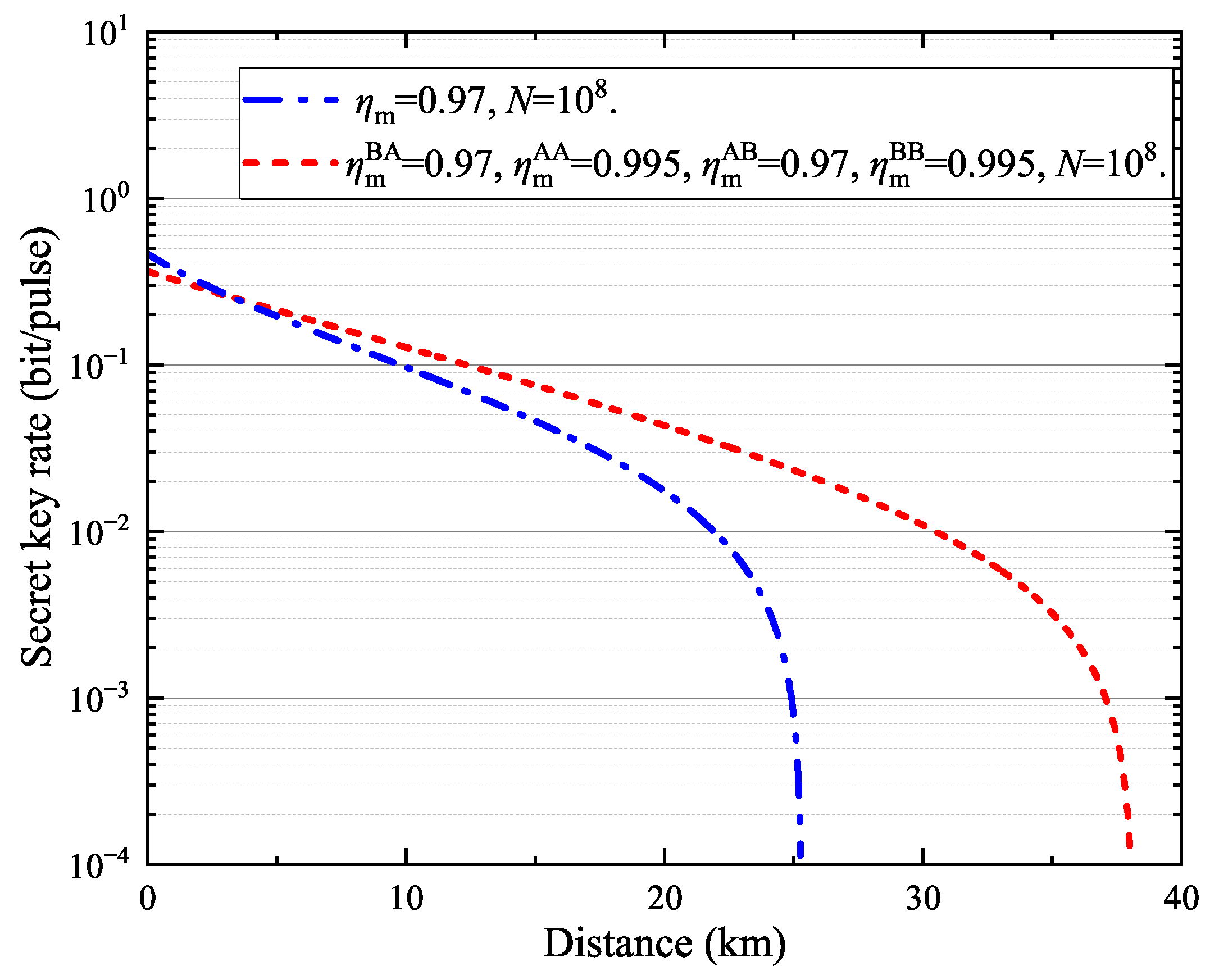Figure 4 represents the improved two-way protocol, while the blue dash-dotted line represents the one-way protocol. It can be observed that the maximum transmission distance of the improved two-way protocol reaches 38.04 km, which is approximately 50% higher than the one-way protocol, whose maximum transmission distance is 25.27 km. Moreover, by further reducing the excess noise or improving the mode matching between the transmitter and the receiver through digital signal processing techniques, the performance advantage of the improved two-way protocol over the one-way protocol can be further enhanced.