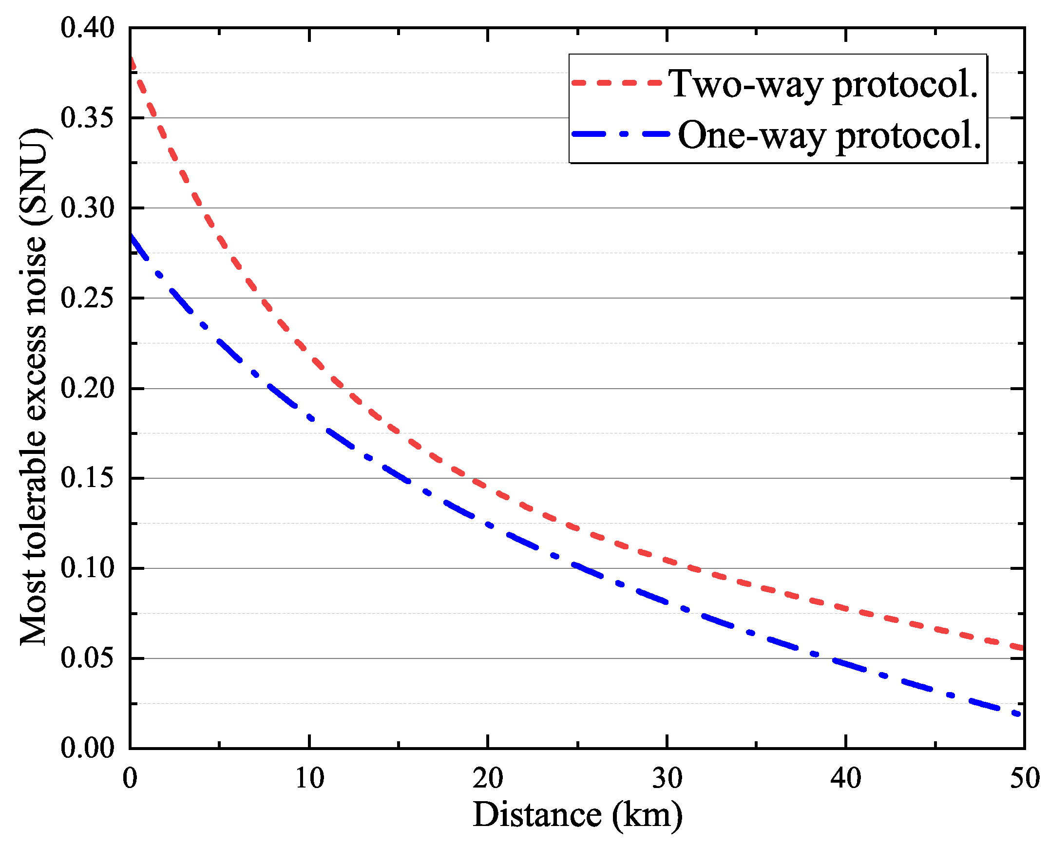 Figure 4, the one-way protocol is no longer feasible under these conditions. At a metropolitan-scale distance of 50 km, the maximum tolerable excess noise of the improved two-way protocol exceeds 0.05, while that of the one-way protocol is only 0.0182. In this case, the improved two-way protocol can tolerate approximately three times more excess noise than the one-way protocol. Moreover, as the transmission distance increases, system performance becomes increasingly sensitive to excess noise, making the advantages of the two-way protocol more pronounced.