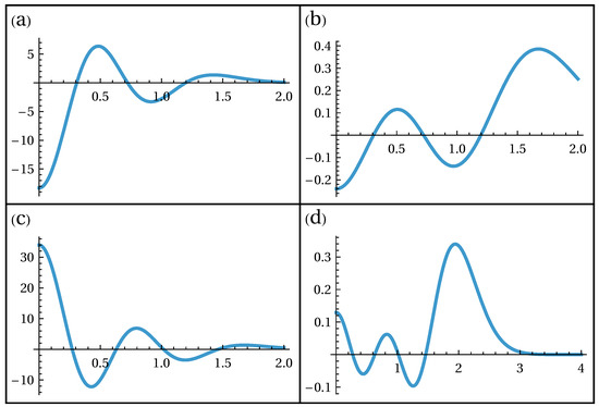 The plot for the case where for Cahill–Glauber and weights can be seen in Figure 4 for . Notice that using different weights changes only the amplitude and the values of the functions when crossing the abscissa axis, and therefore they are not important. What remains unchanged for different weights, and is thus the important feature, is the number of oscillations (crosses of the abscissa axis). In the present case, this number is three.