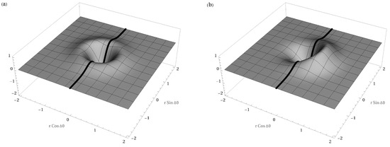 Plot of the classical phase space function f for (a) the mixed state (Equation (47)) and for (b) the entangled pure state (Equation (59)). We set , , and . The mixed-state case does not depend on ; therefore, it is invariant under the effect of rotations. The black curve in (b) corresponds to and ; it is exactly the same curve as in (a).