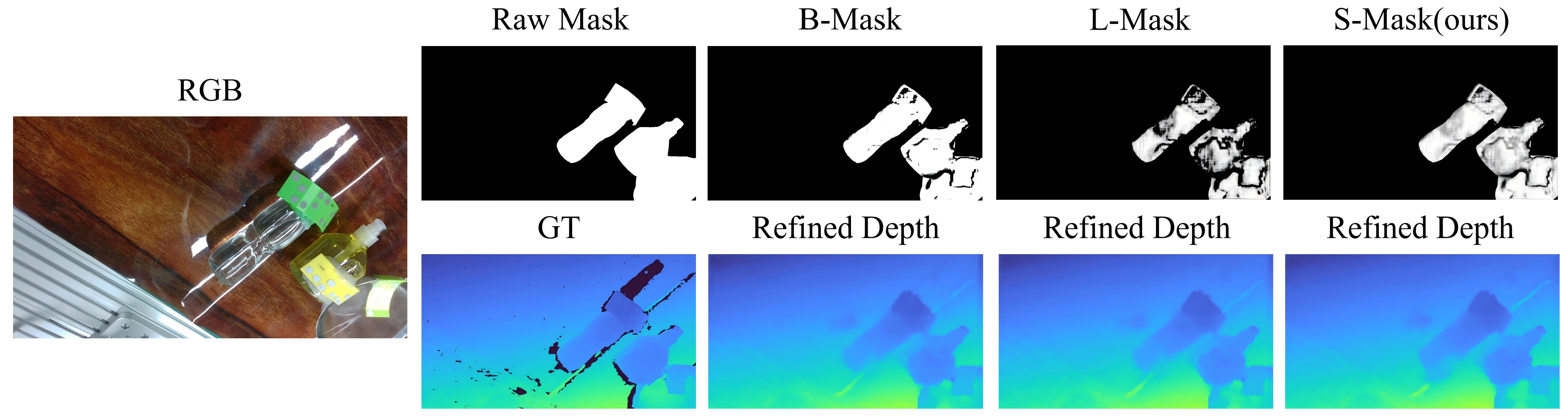 - Liu, J.; Ma, H.; Guo, Y.; Zhao, Y.; Zhang, C.; Sui, W.; Zou, W. Monocular depth estimation and segmentation for transparent objects with iterative semantic and geometric fusion. arXiv 2025, arXiv:2502.14616. [Google Scholar] [CrossRef]