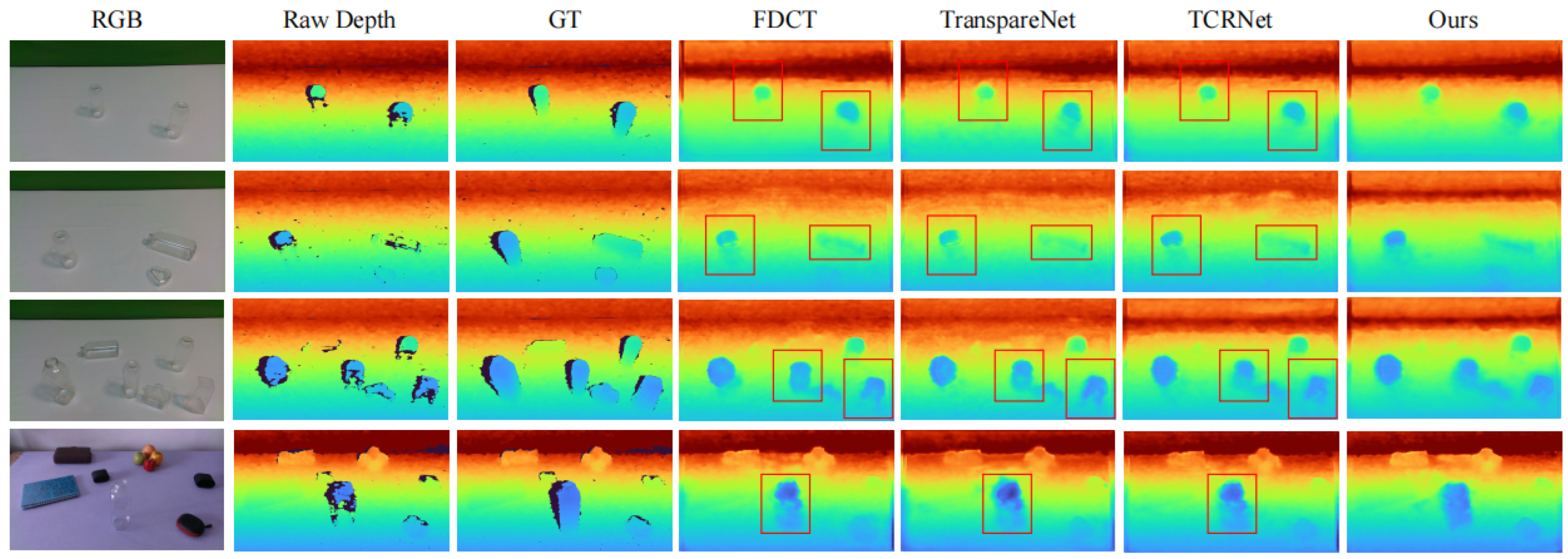 - We develop a confidence-aware feature modulation strategy that selectively refines unreliable depth predictions while preserving high-confidence geometric information, significantly improving completion accuracy in challenging transparent regions.