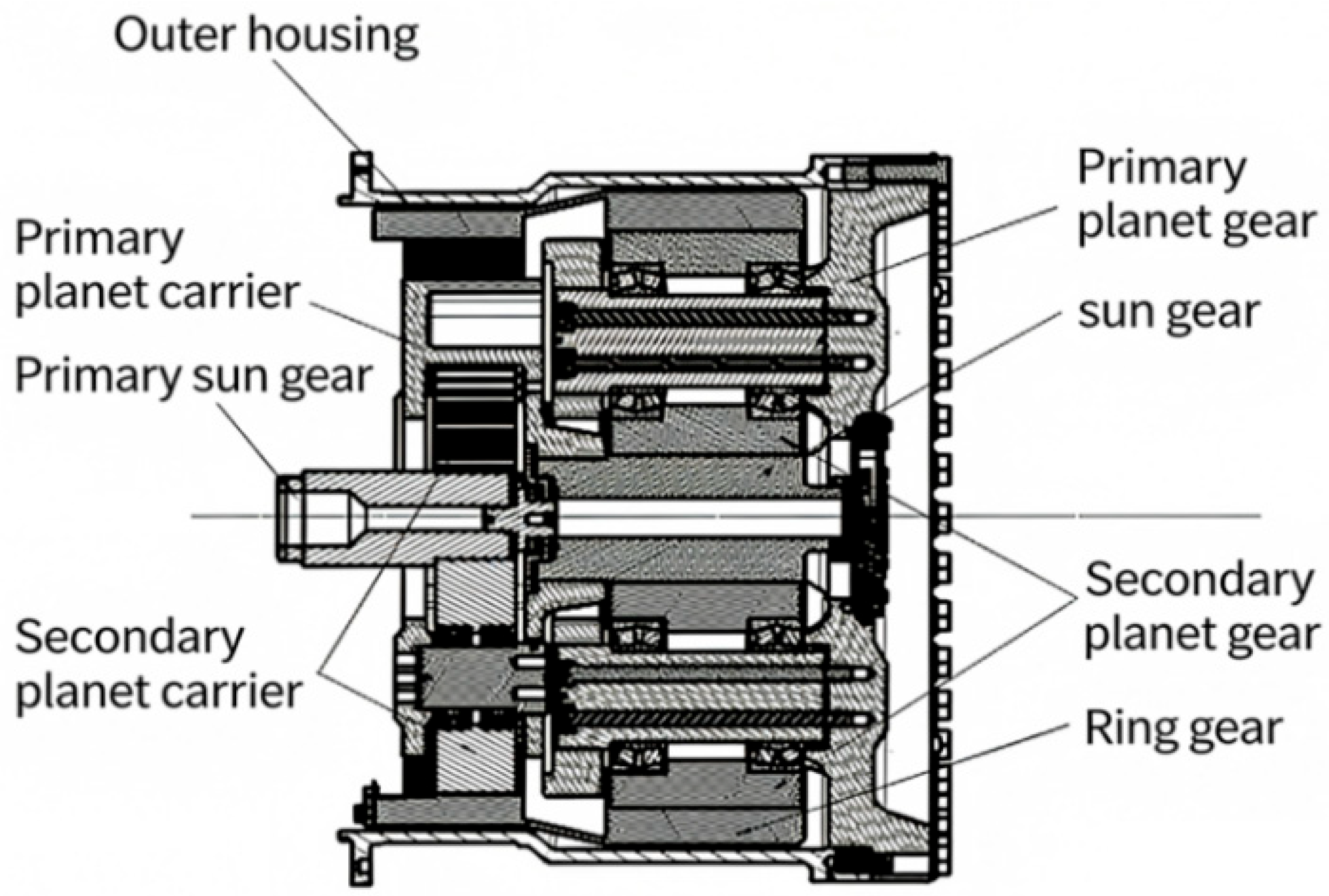 - In the actual production of the planetary gear reducer studied in this paper, the primary ring gear and the secondary ring gear are an integral part. For the convenience of research, it is assumed that the primary ring gear and the secondary ring gear are two separate mass blocks.
