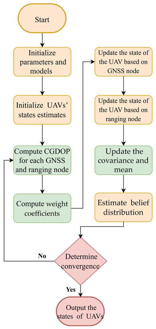 | Input: UAVs’ state , number of UAVs, maximum iterations , optimization dimension , measurements , convergence threshold . Initialize parameters and model; Initialize UAVs’ states using the state message at time and the IMU measurements by Equation (13); While and ) do For all UAVs do For all and nodes do Compute CGDOP for each constraint factor by Equation (8); Compute weight coefficients by Equation (18); End for Update the state of the UAV based on by Equation (14); Update the state of the UAV based on by Equation (15); Update of the covariance and mean by Equations (20) and (21); End for End while Return: ; Output: State estimates of UAVs from the converged beliefs. |