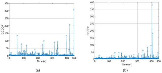 Figure 5 illustrates the temporal variation of CGDOP under different master–slave UAV formation configurations. Table 3 presents the distribution of CGDOP values across different levels. As shown in Figure 5a, a large number of CGDOP values exceed 50, indicating poor geometric satellite-vehicle geometry. In Figure 5c, CGDOP values exhibit relatively high peaks, and the proportion of values falling within Level B is low. Figure 5d shows a more dispersed distribution, with numerous CGDOP values exceeding 20, reflecting moderate positioning performance. In contrast, Figure 5b demonstrates greater stability: although two values are slightly elevated, the majority remain within Level B, resulting in an overall stable and favorable CGDOP profile.