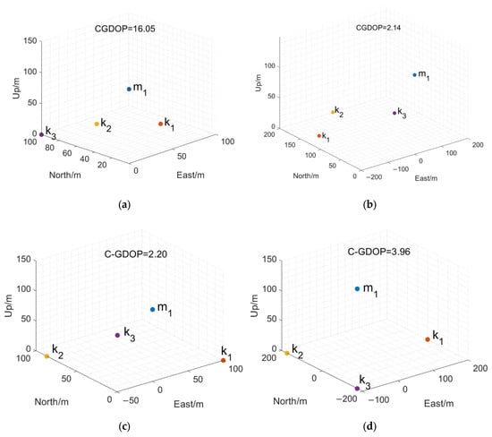 In the CGDOP model, the observation vectors between satellites and the master UAV, as well as those between the master and its slave UAVs, jointly influence the CGDOP value, which serves as an indicator of positioning accuracy to a certain extent. The following analysis examines how different master–slave configurations affect CGDOP. Four typical formation configurations are derived from the UAV flight trajectories, and the three-dimensional coordinates of each UAV in these formations are presented in Table 2.