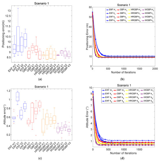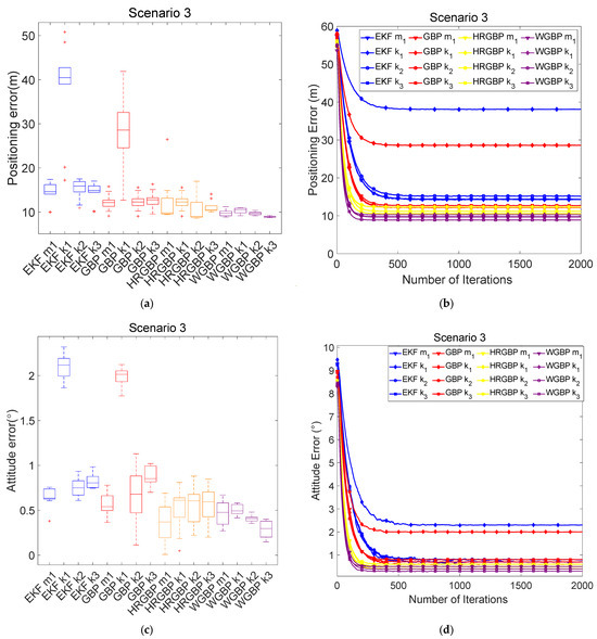 Figure 7 presents comparative performance results of all algorithms in Scenario 1. As shown in Figure 7, EKF exhibits the largest positioning error (median 9–11 m) and slowest convergence. GBP reduces the error to 8.5–9.5 m, while HRGBP and WGBP achieve further improvements, with WGBP showing the smallest error (8.5–9 m), narrowest distribution, and fastest convergence. For attitude estimation, EKF again performs worst, with a median error of 0.6–1.2° and large fluctuations. GBP reduces the error to 0.3–0.8°, followed by HRGBP (0.3–0.6°). WGBP achieves the best performance, with the lowest median error (0.2–0.4°), most compact distribution, and fastest convergence to a minimal steady-state error.